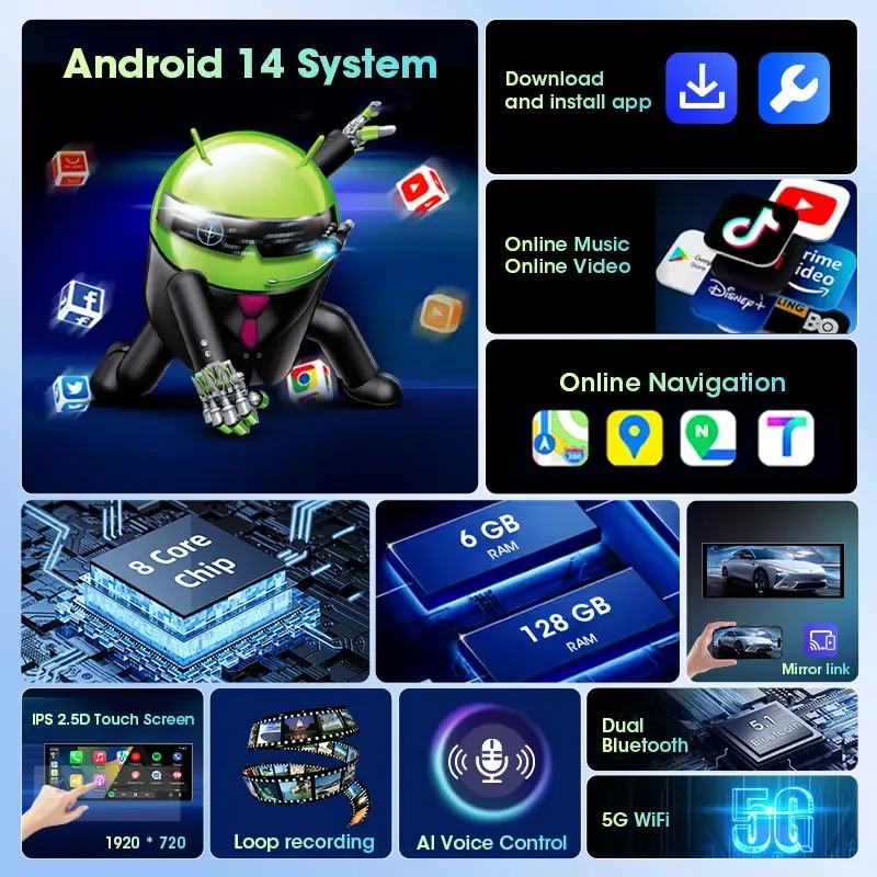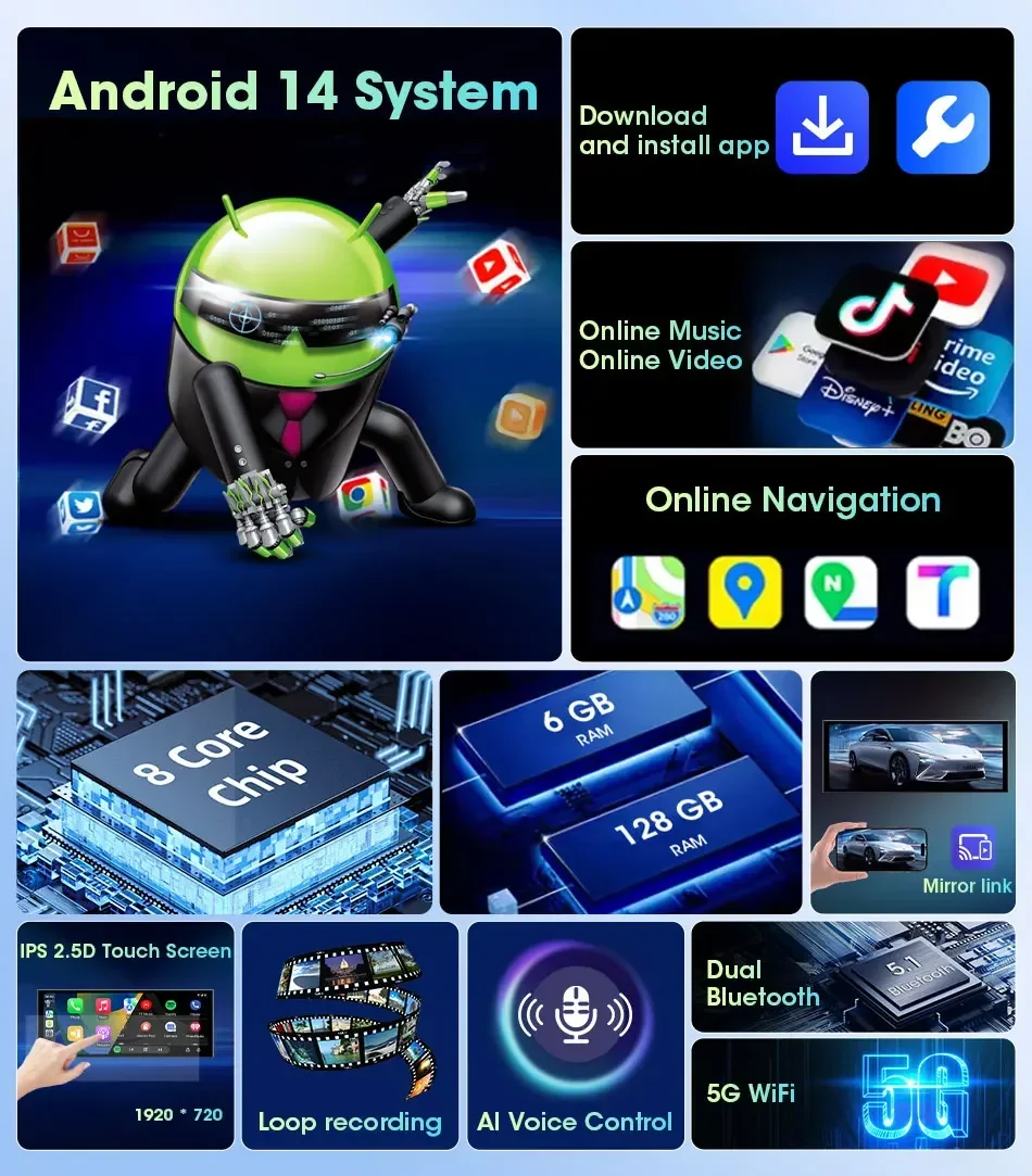 (6) Android 14 System:Built-in Youtube,Netflix,Map,Google Play Store etc;you can install more apps;