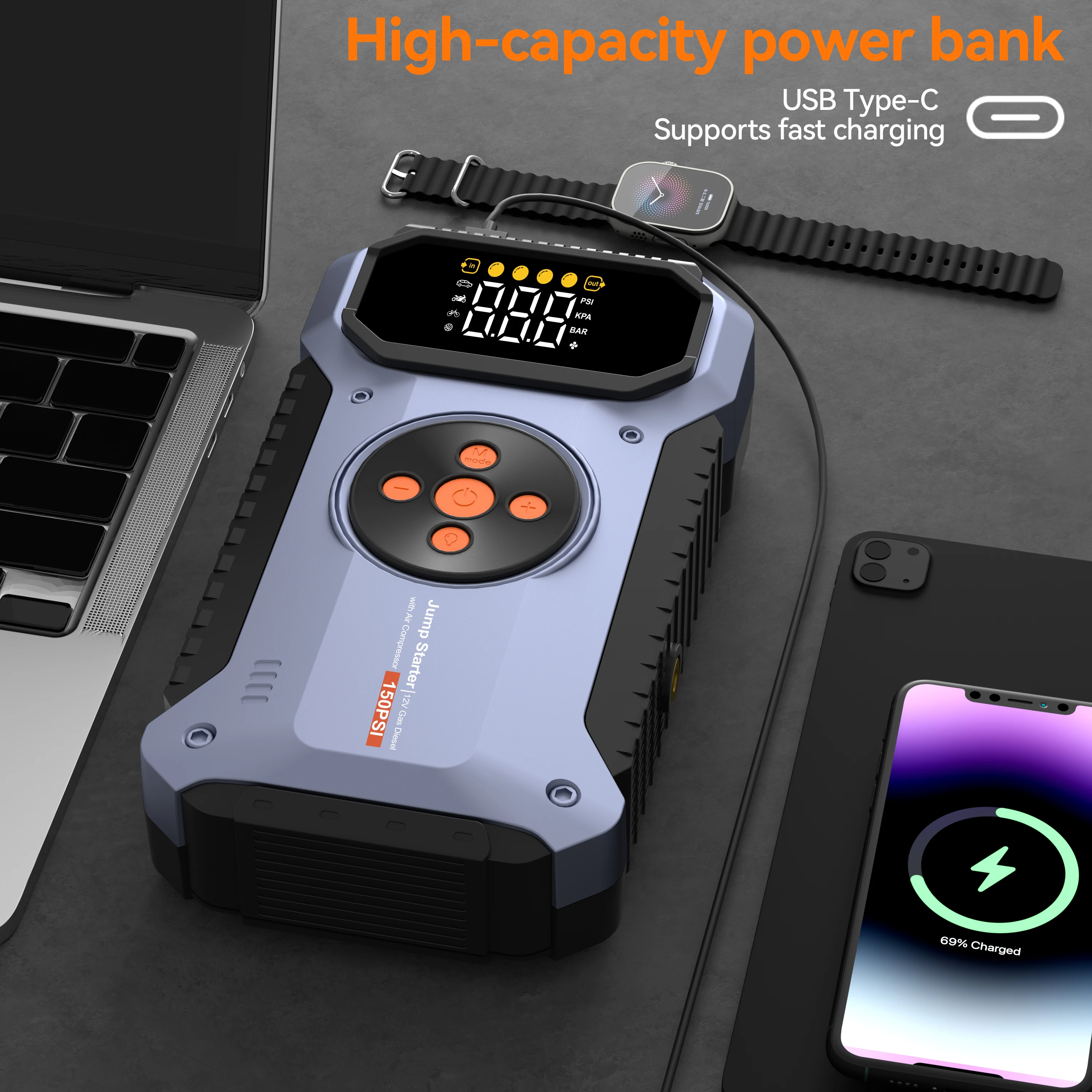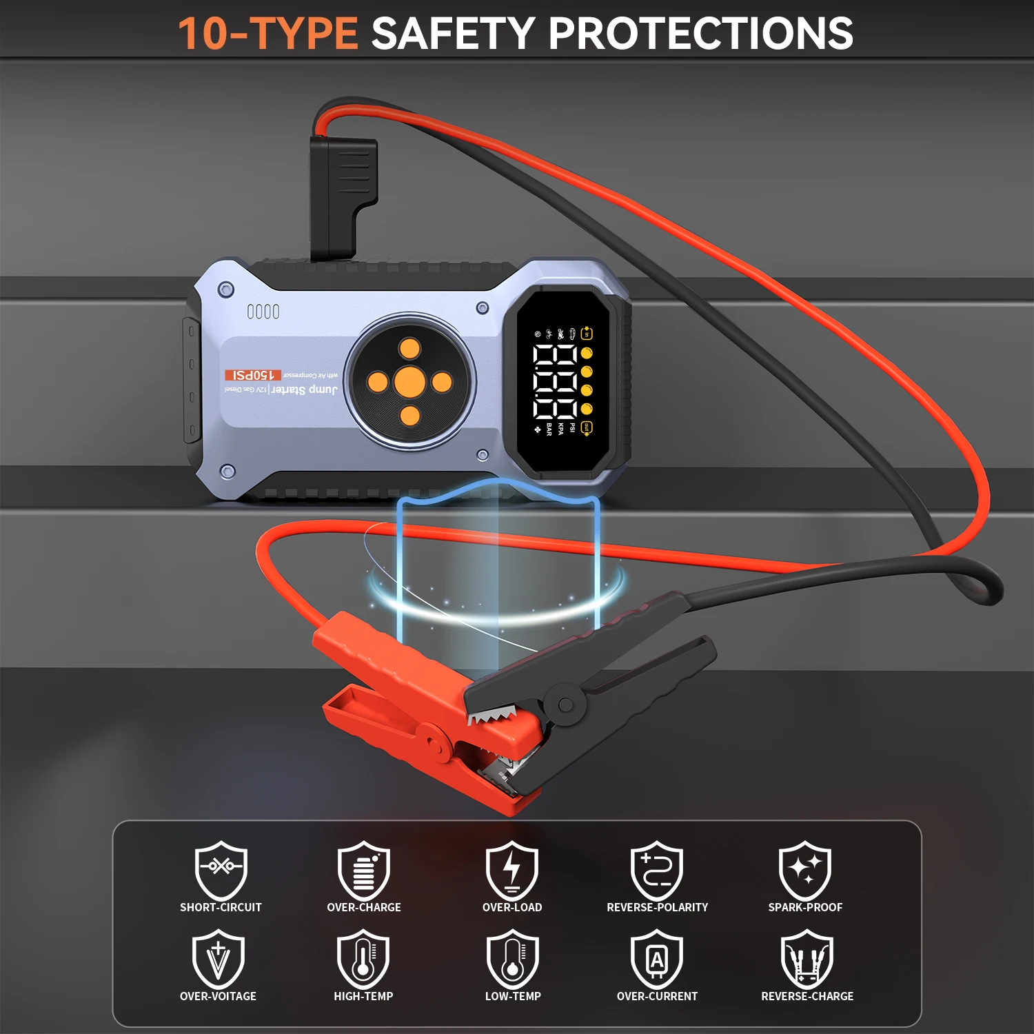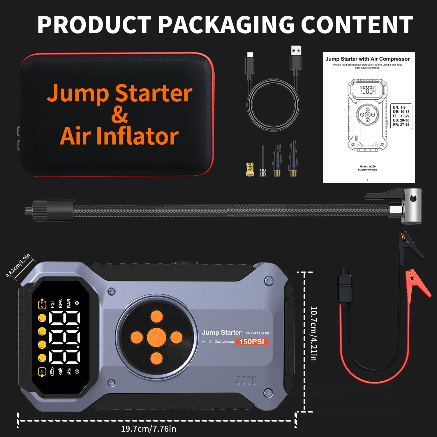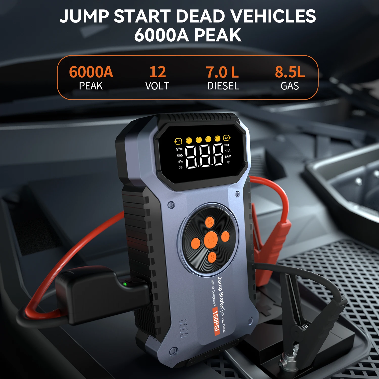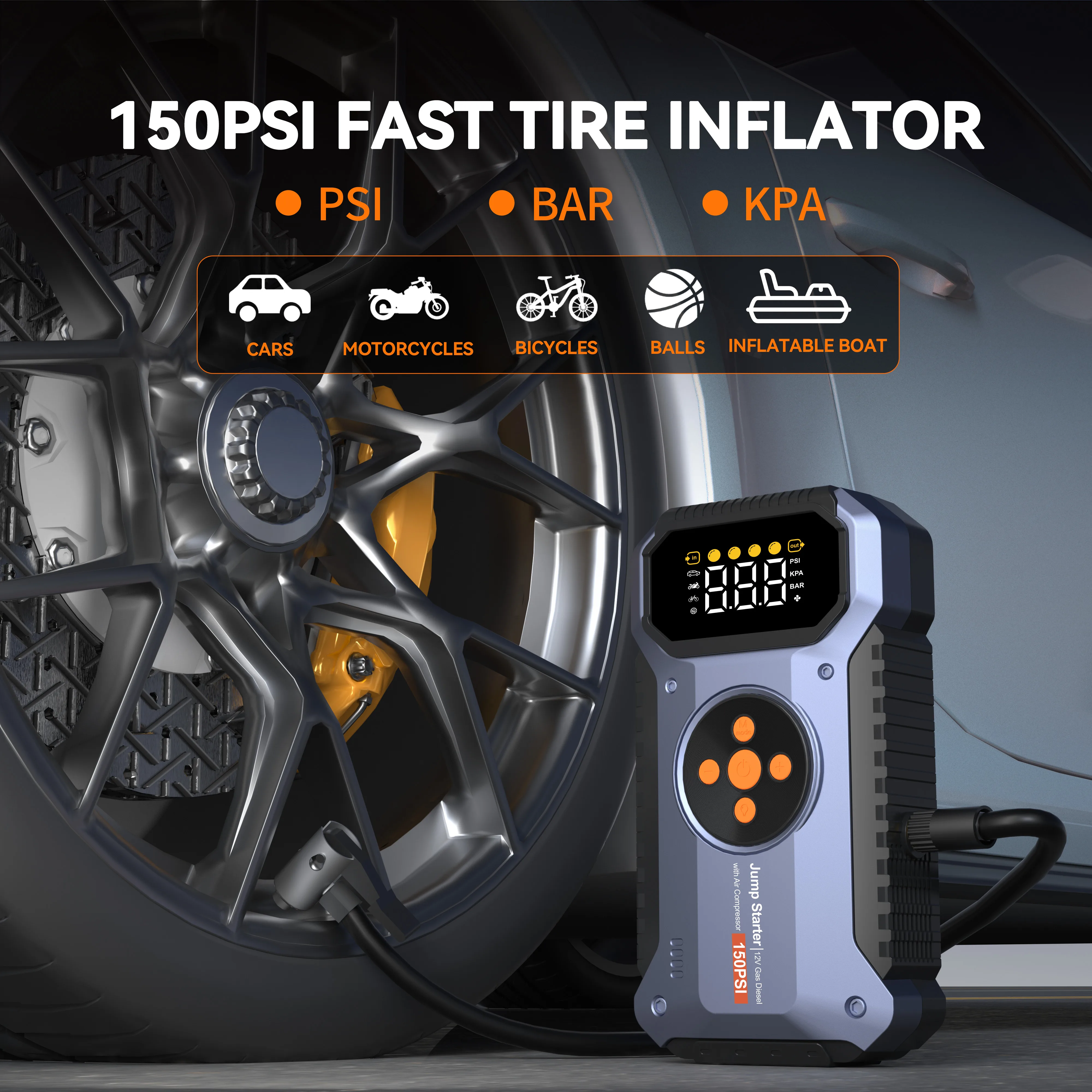Multifunctional Air Pump Jump Starter with Air Compressor 3000A Peak/150PSI Battery Jump Starter Digital Tire Inflator