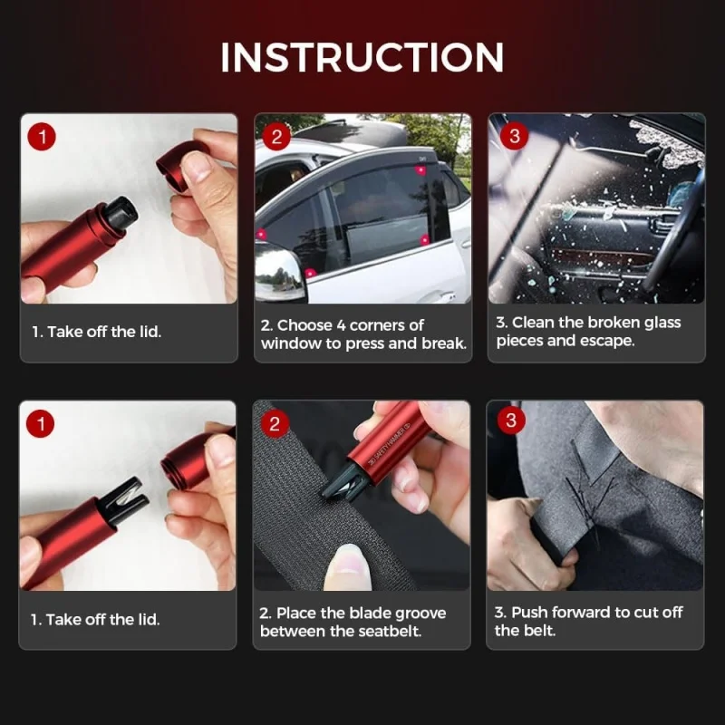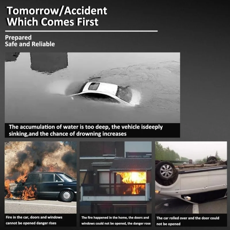 4:U-Shaped Anti-Cut Stainless Steel Cutter at the Tail: Safely cuts seatbelts swifly to escaperestraints.