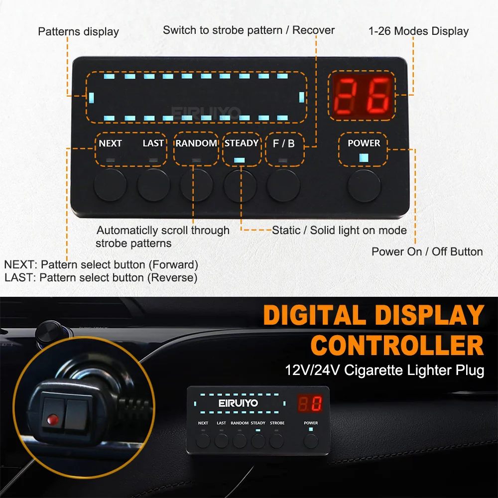 26 Flash modes with new digital display switch. 12V/24V Universal!