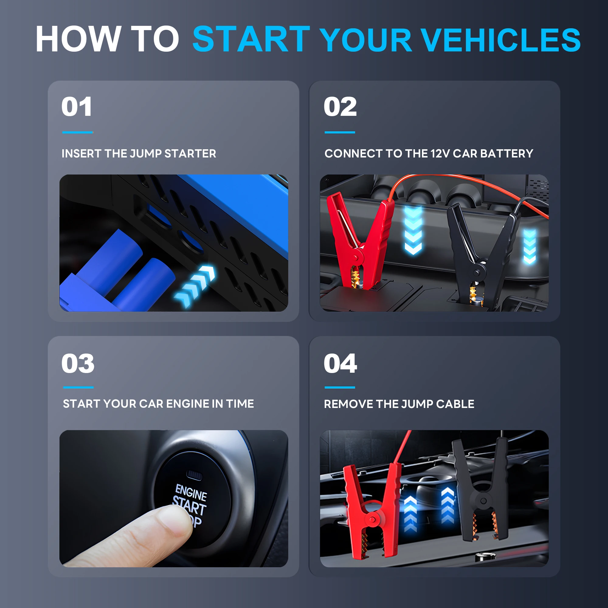 1.The product has just been received, you must first turn on the flashlight to discharge, then charge the product for more than 4 hours before starting the car, because the product's battery is empty. This operation can prolong the service life of the product!