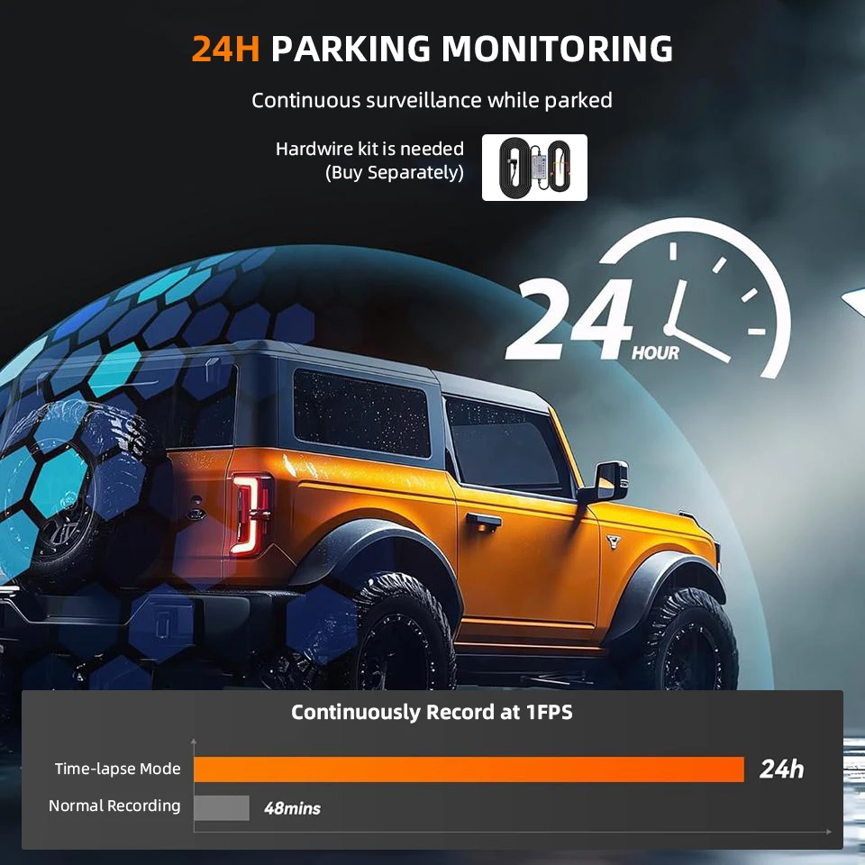 Taking a 16G memory card as an example, only about one hour of video can be recorded in the 30-frame per second mode. After the time-lapse recording function is enabled, recording time under 1 frame per second mode will reach 30 hours (more than 24 hours), which will increase the maximum recording time and data storage by 30 times, ensuring the integrity of the recorded content, greatly saving memory Card space and protect your vehicle for more than 24 hours.(Note: Need to buy a buck line)