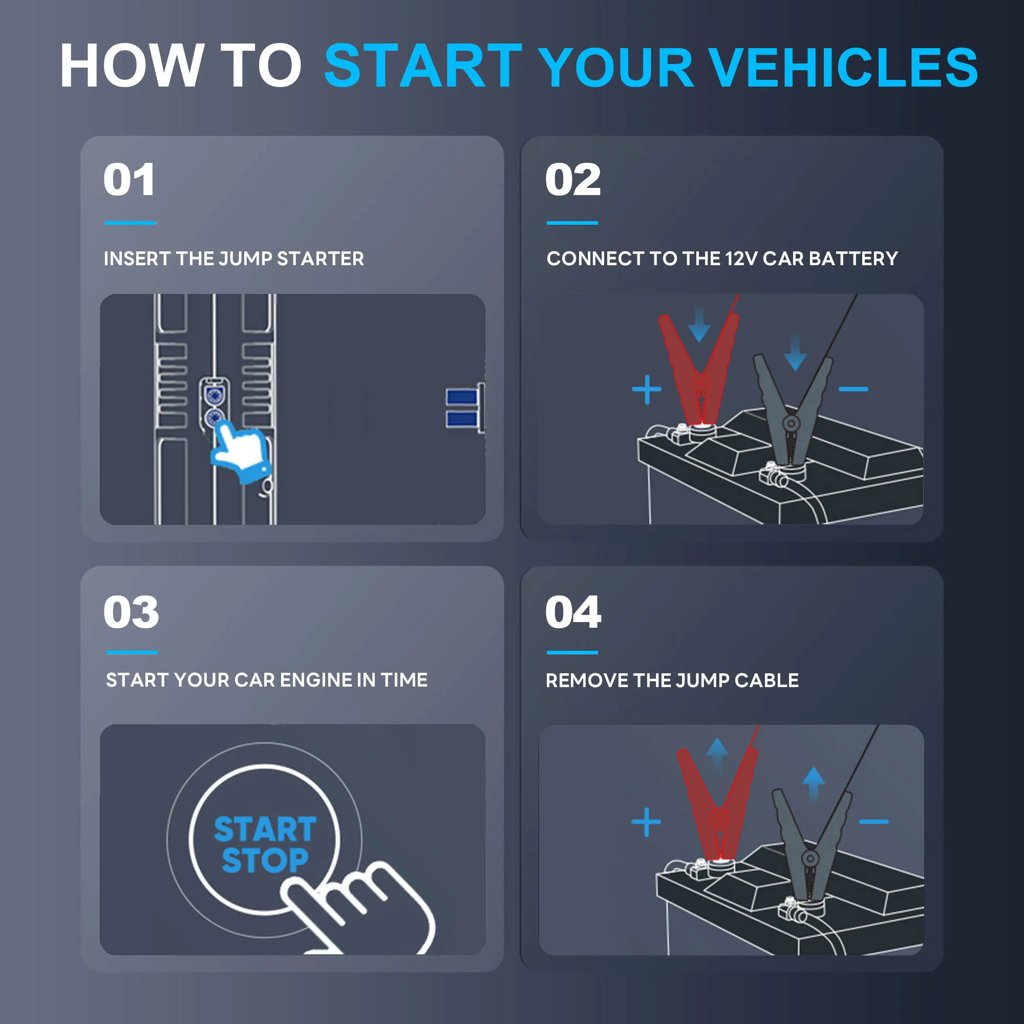 1.The product has just been received, you must first turn on the flashlight to discharge, then charge the product for more than 4 hours before starting the car, because the product's battery is empty. This operation can prolong the service life of the product!