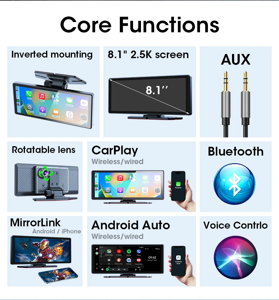 8.1 inch Wireless Carplay&Android Auto 2.5K Car DVR Multimedia 5G WIFI Dashcam Rearview Camera GPS Navigation Dashboard FM AUX