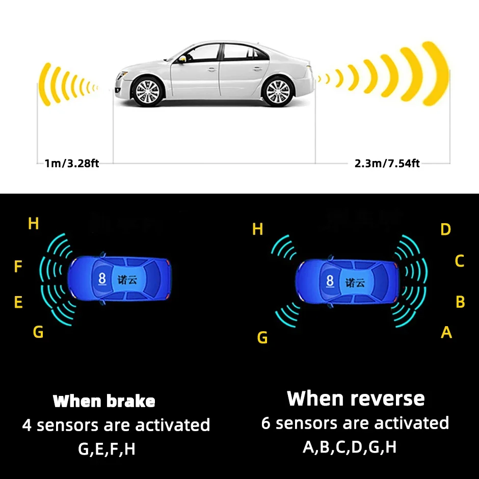 1: When the car is backing up, 6 sensors are activated, four at the rear of the car, anti-collision, and two at the front of the car, anti-scratch angle.