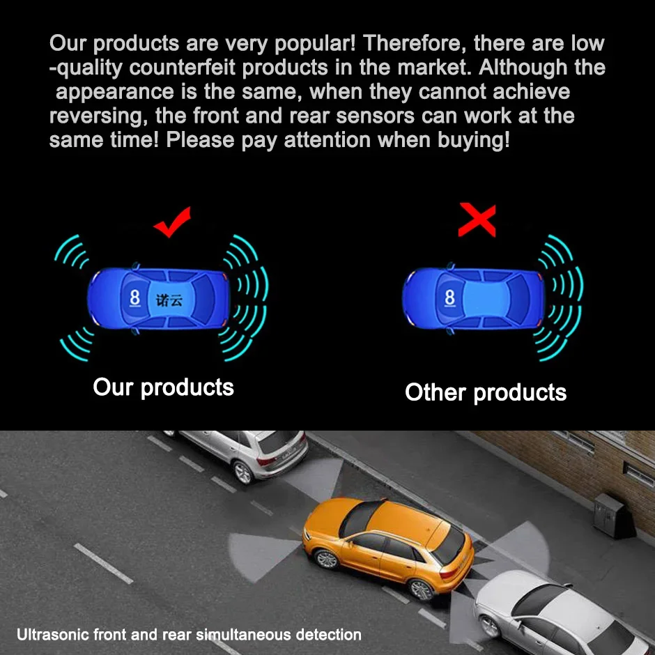 Our products are very popular! Therefore, there are low -quality counterfeit products in the market. Although the appearance is the same, when they cannot achieve reversing, the front and rear sensors can work at the same time! Please pay attention when buying! (Only 6 or 8 sensor products have this function)