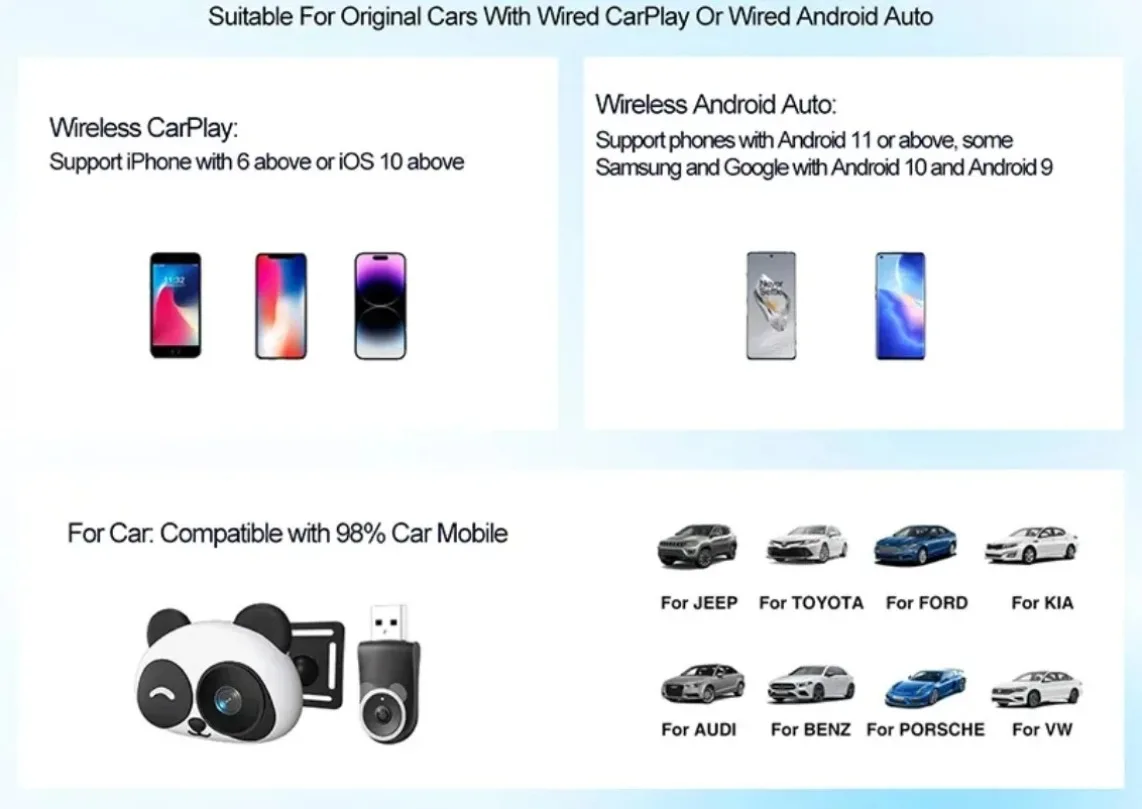 2.For android car: compatible with android 11 and above models, and the phone supports android car wireless.It should be noted that huawei phones are special.Huawei devices have their own mobile-emui operating system.Unfortunately, android car wireless is not compatible with emui.