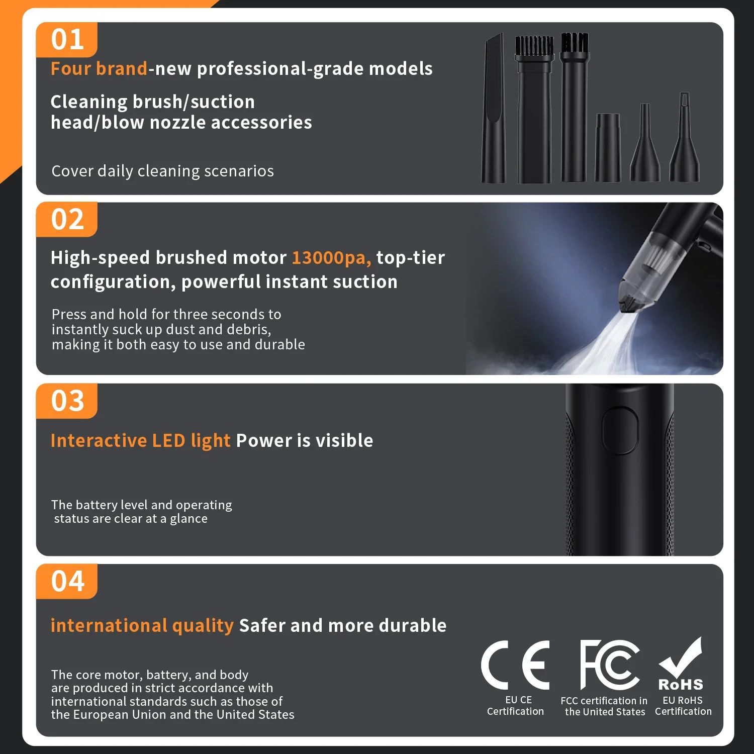 【 13,000pa high power】the rechargeable car vacuum features cutting-edge brushless motor technology, reaching up to 80,000rpm and delivering 13,000pa of suction power.Compared to traditional motors, the brushless design offers stronger suction, enhanced performance, and a longer lifespan.