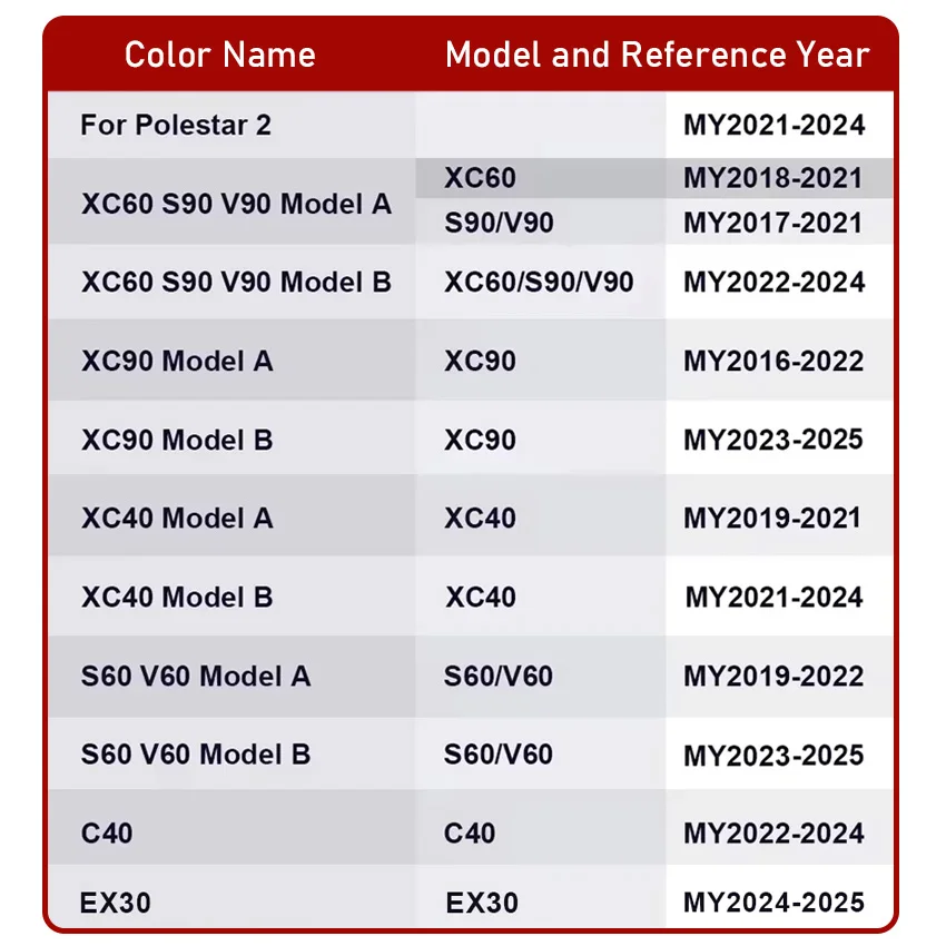 - fit:: for VOLVO XC90 XC60 XC40 S90 V90 S60 V60 V40 C40 EX30 EX40 EC40 Polestar 2