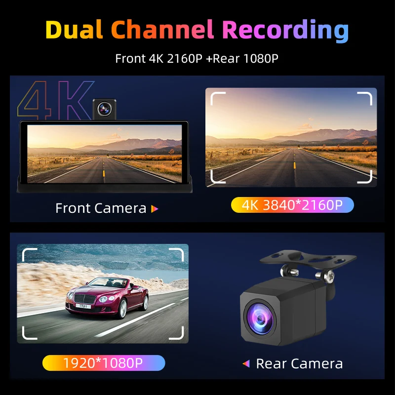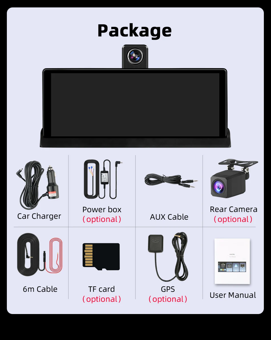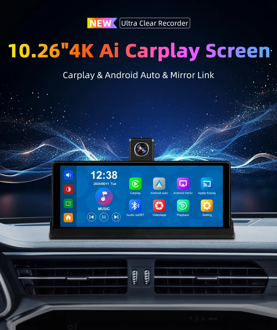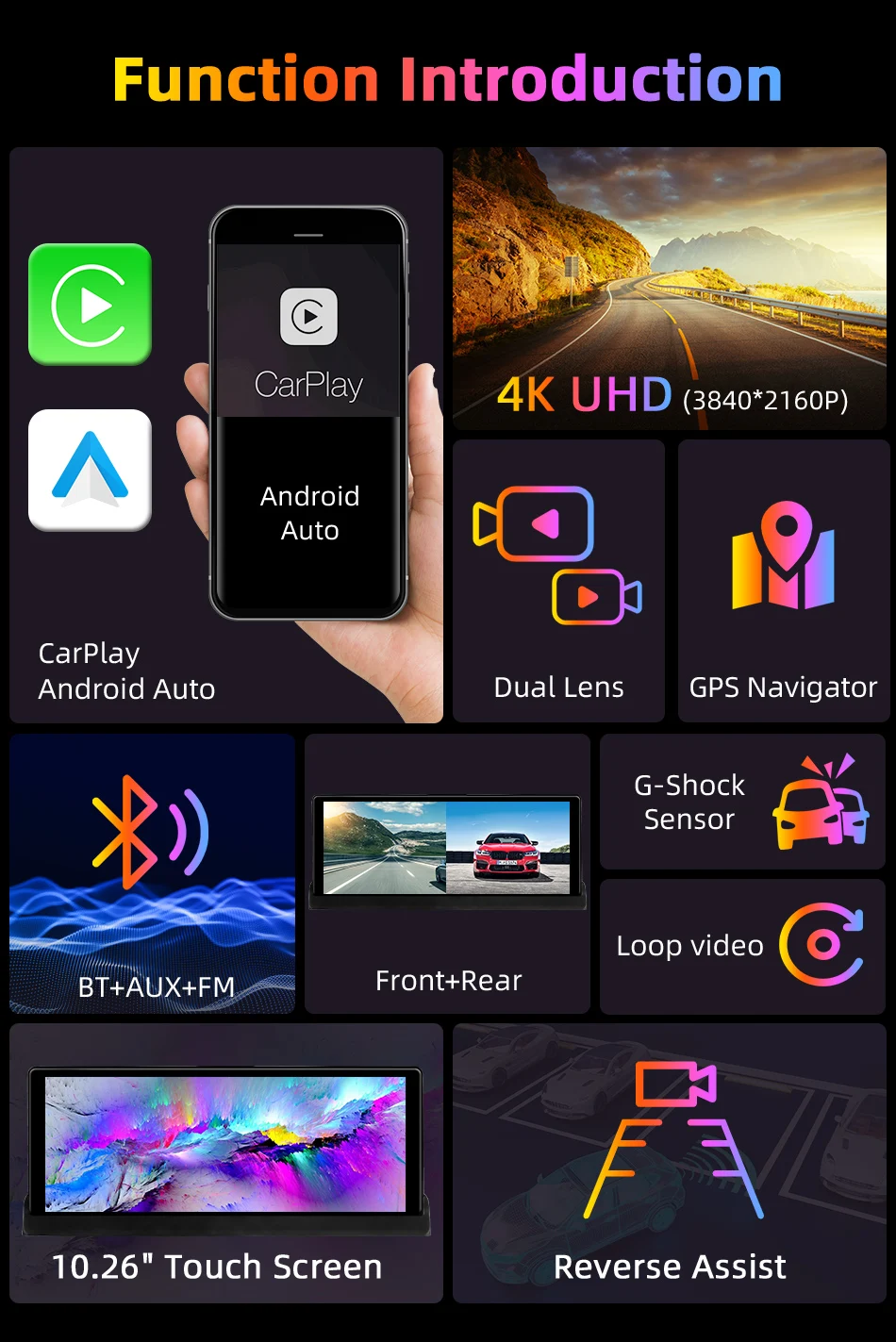 Carplay, Android Auto, 4K front camera, voice control, mobile screen projection, FM+Bluetooth+AUX audio output,GPS Nacigation,10.26 inch touch screen,recerse assist