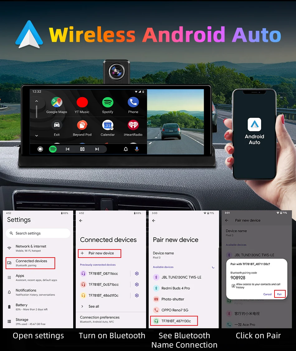 First pair the mobile phone with Bluetooth, and then it will automatically connect to the WIFI signal. After both are connected, carplay/android auto will automatically jump to the corresponding interface.