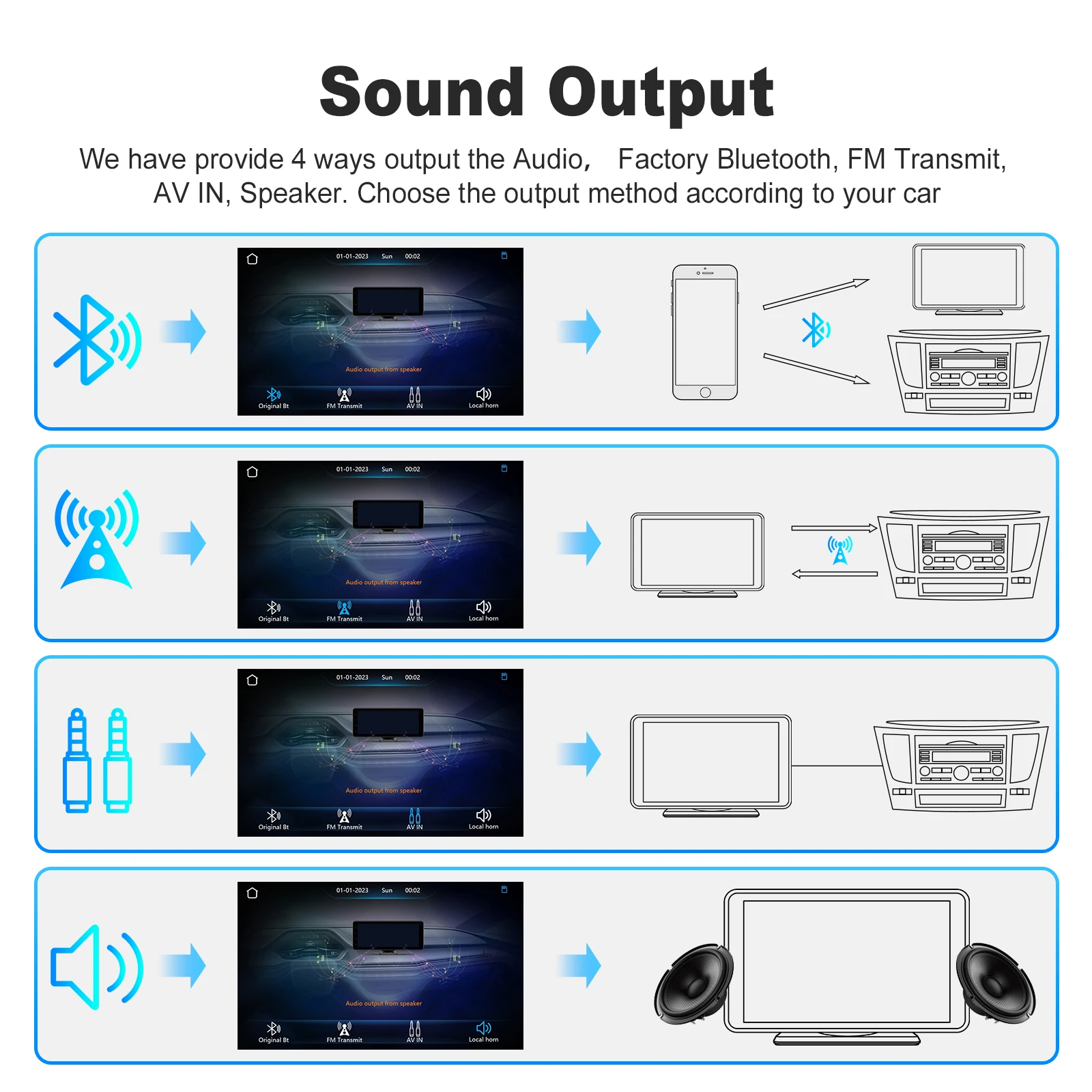 The monitor has a built-in speaker, but if you want louder sound, you can transmit it to the car's speakers: