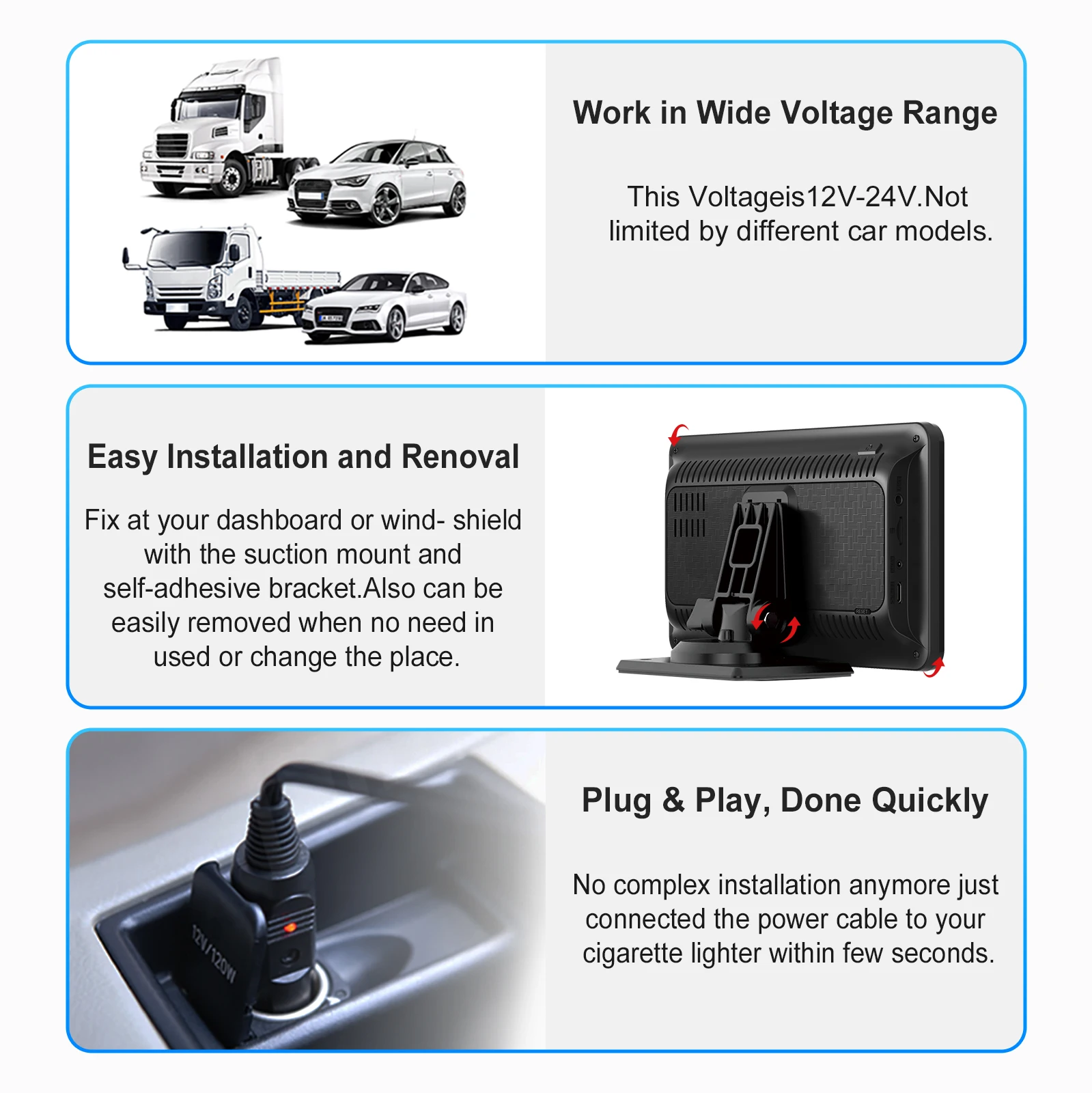 The monitor with 7" touch screen (Plug and Play, suitable for all cars) comes with a strong stand with suction cup, a stand for fixed mounting on the dashboard, etc. No need to disassemble the car dashboard.
