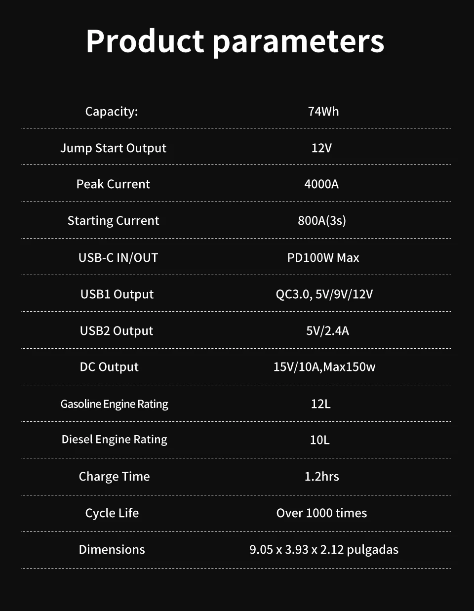 - Car Jump Start Output: 12V