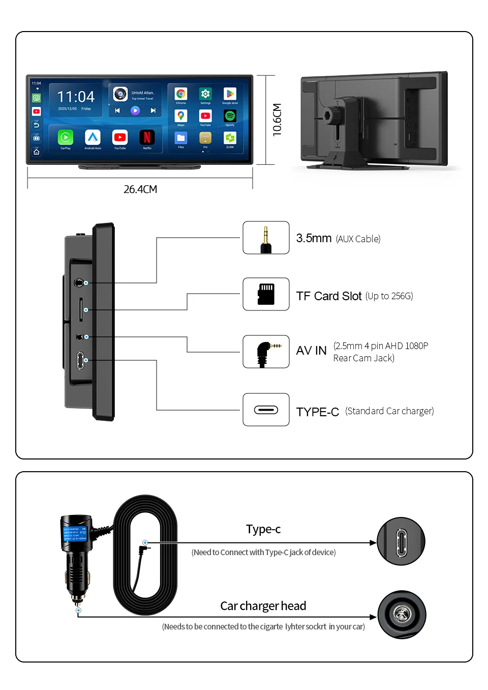 Main Interfaces: TF card slot, Type-C power port, 3.5mm headphone jack, AV IN rear view port