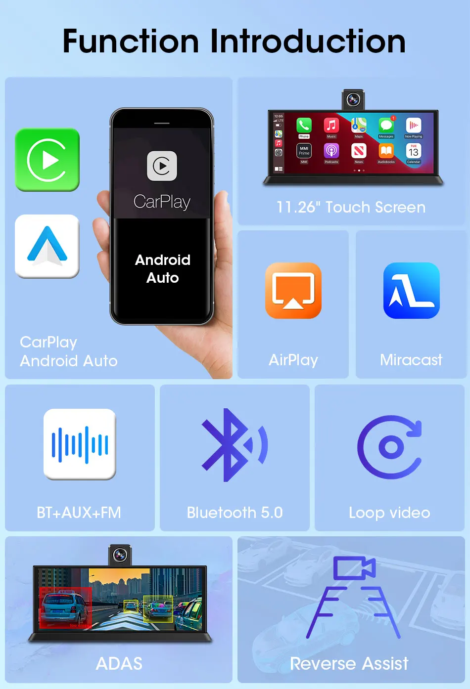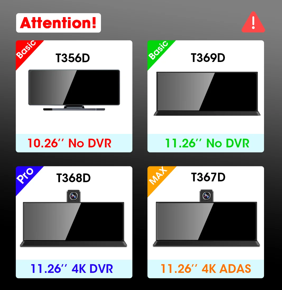 According to different sizes (10.26 inches/11.26 inches) and functions (DVR function, ADAS function), this product has different configurations and corresponding names. Please refer to the specific model you have chosen.