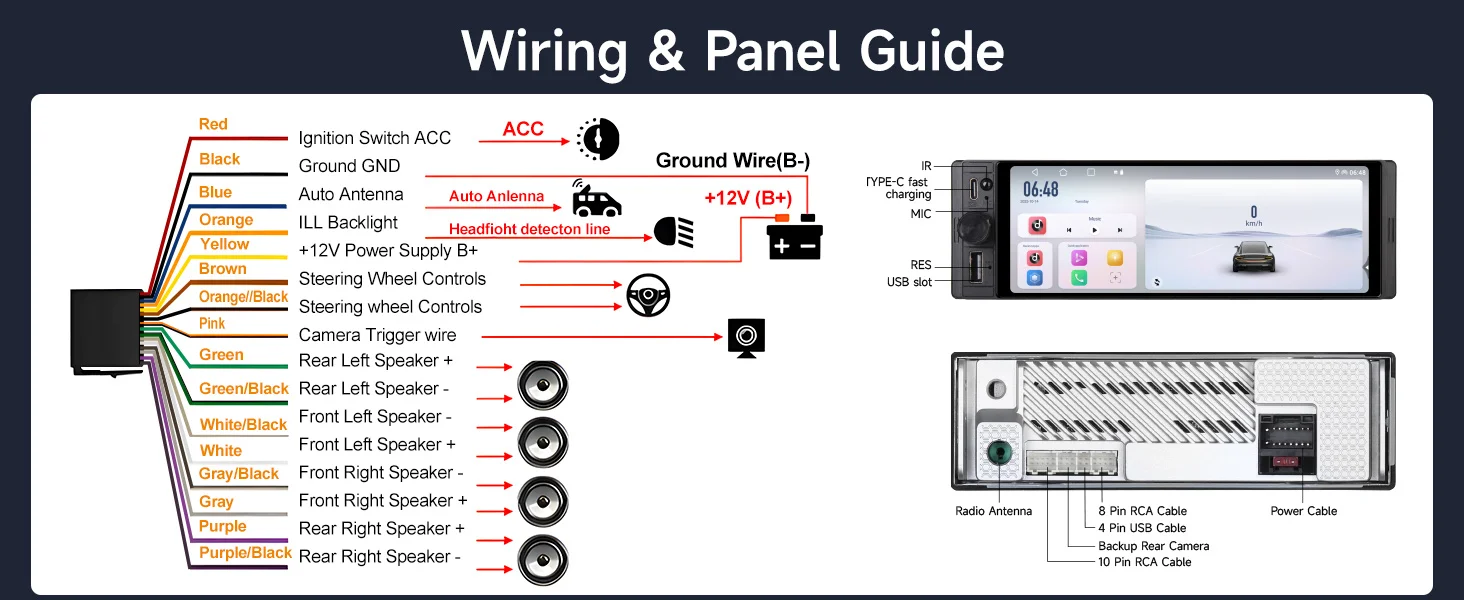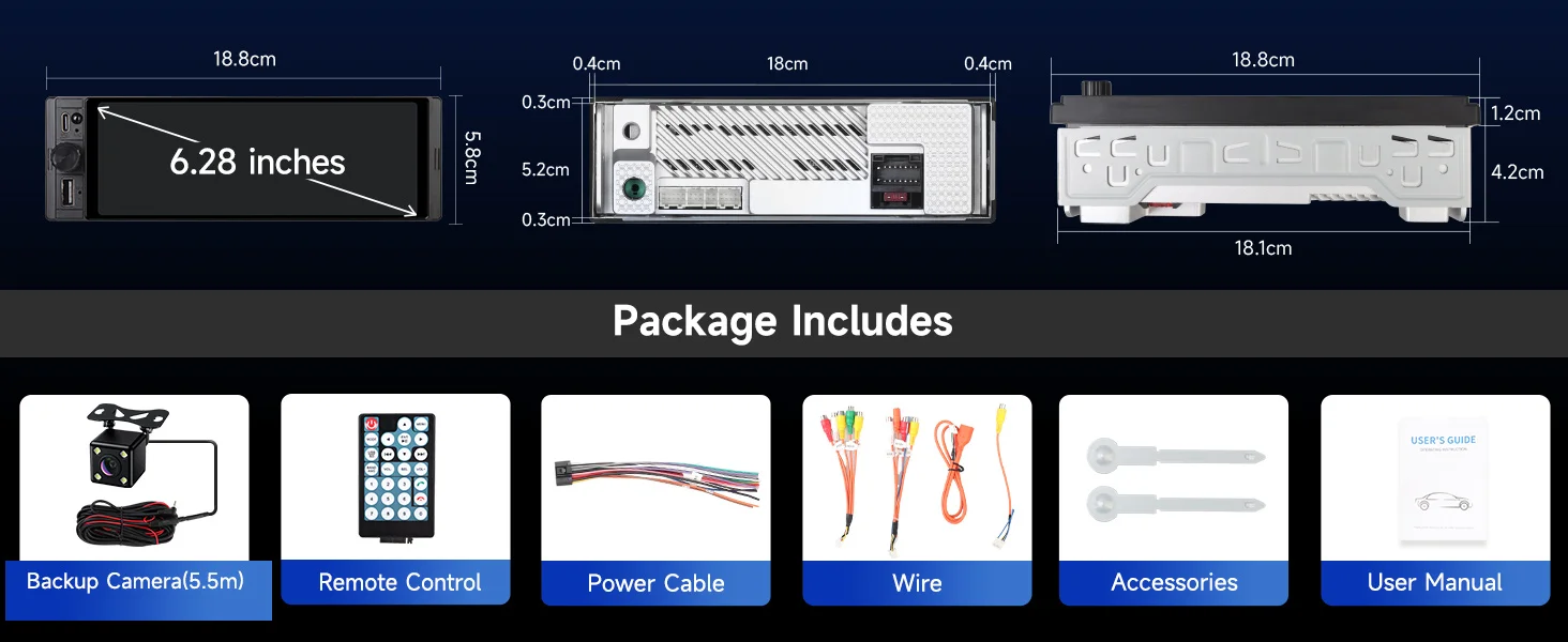 【6.28 Inch Linux System Touch Screen Car Radio】Single din 6 inch touchscreen car stereo is equipped with USB interface, Type-C fast charging slot, 6.28 inch larger touch screen with 1280*452 resolution, power output:45W*4. Fits in cars with single din car radio opening size: and single din car media player comes with a backup camera, remote control, Support steering wheel control