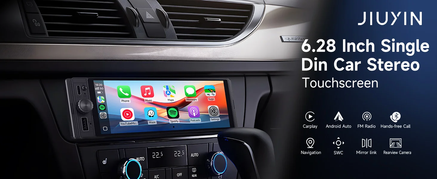 JIUYIN 1Din Car Radio 6.28 inch Universal MP5 IPS Touch Screen Wireless Carplay Android Auto Car Multimedia Player USB BT Type-C