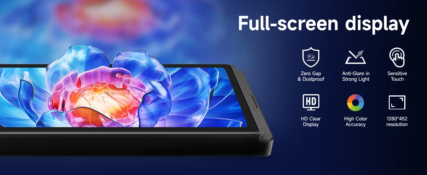 1. Linux system platform, capacitive touch screen, 6.28-inch display with 1280*452 resolution, IPS screen