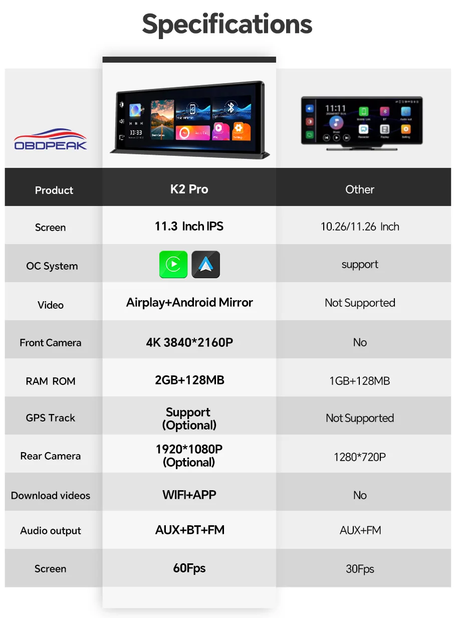 The OBDPEAK K2 Pro has a crazy built-in 2 system, Carplay system/Android Auto system, and has added an Dual Lens to meet all your car driving needs!