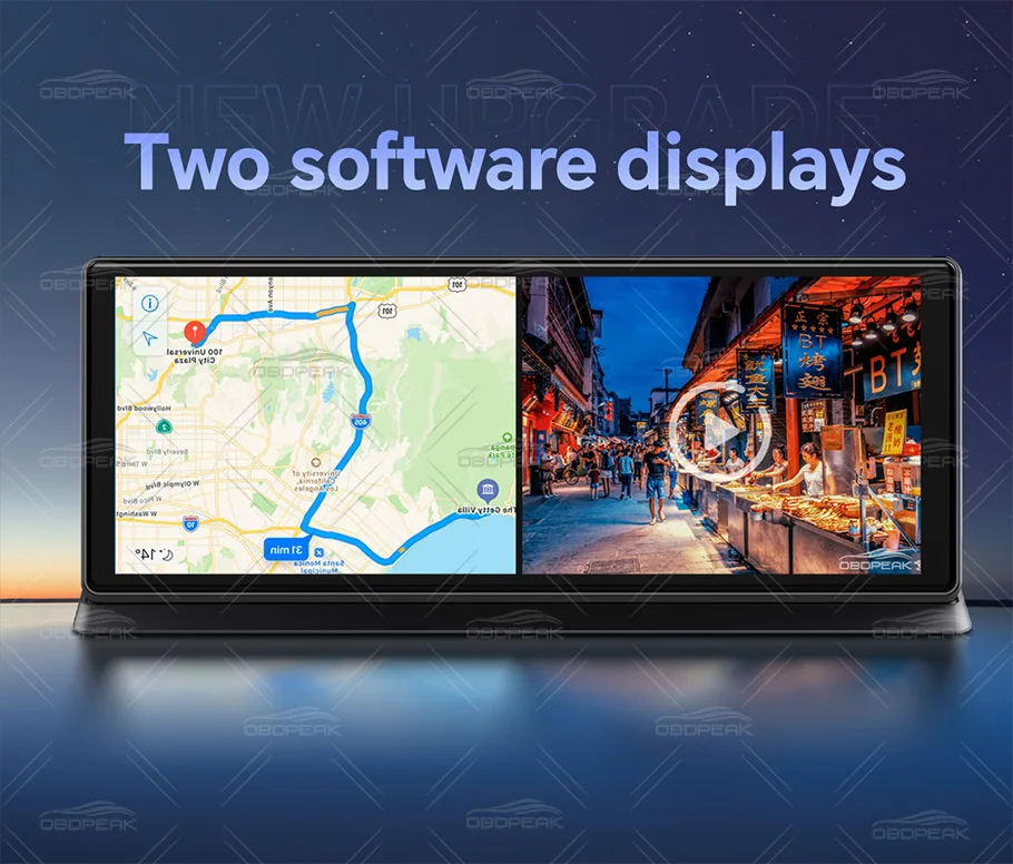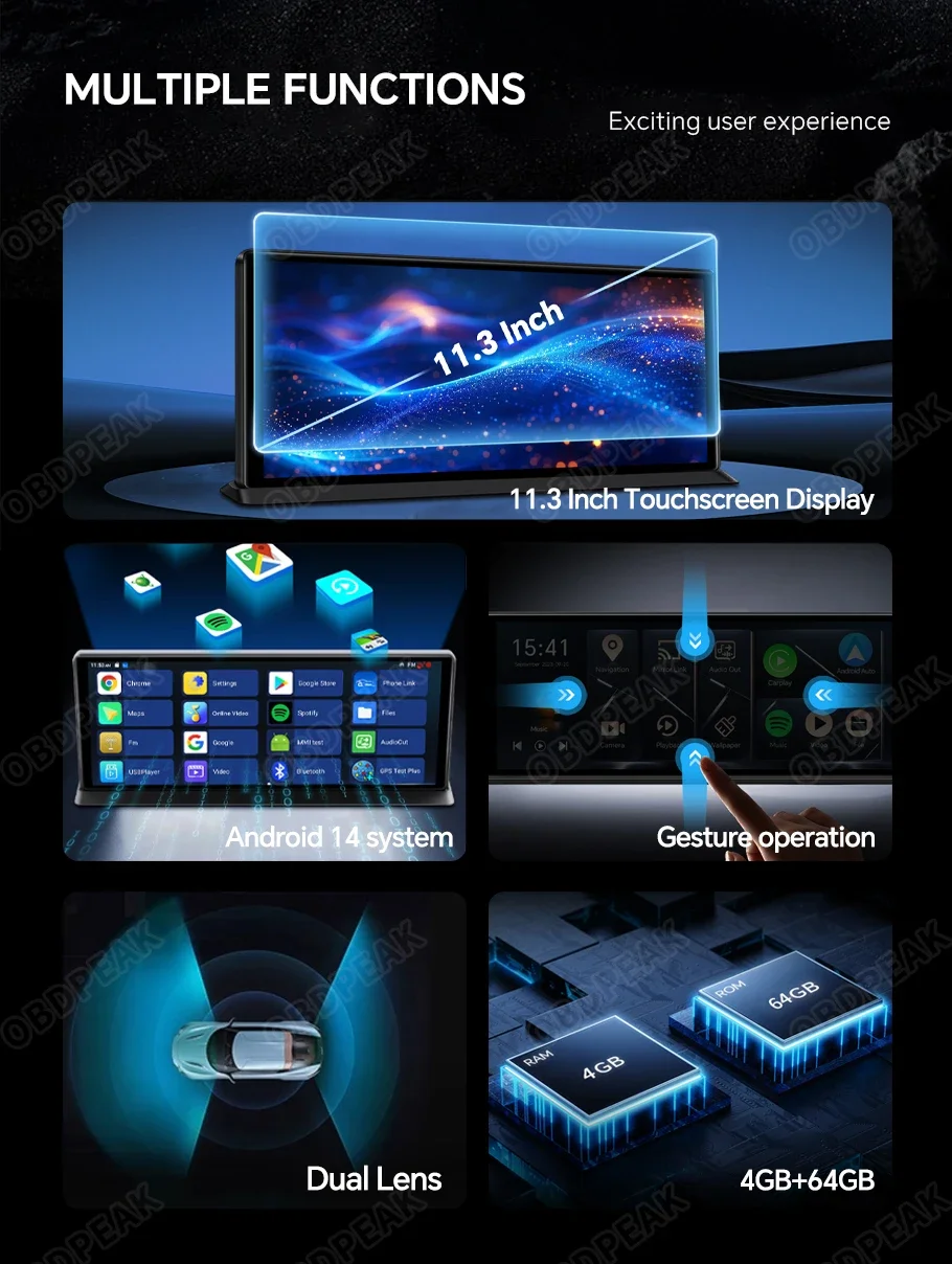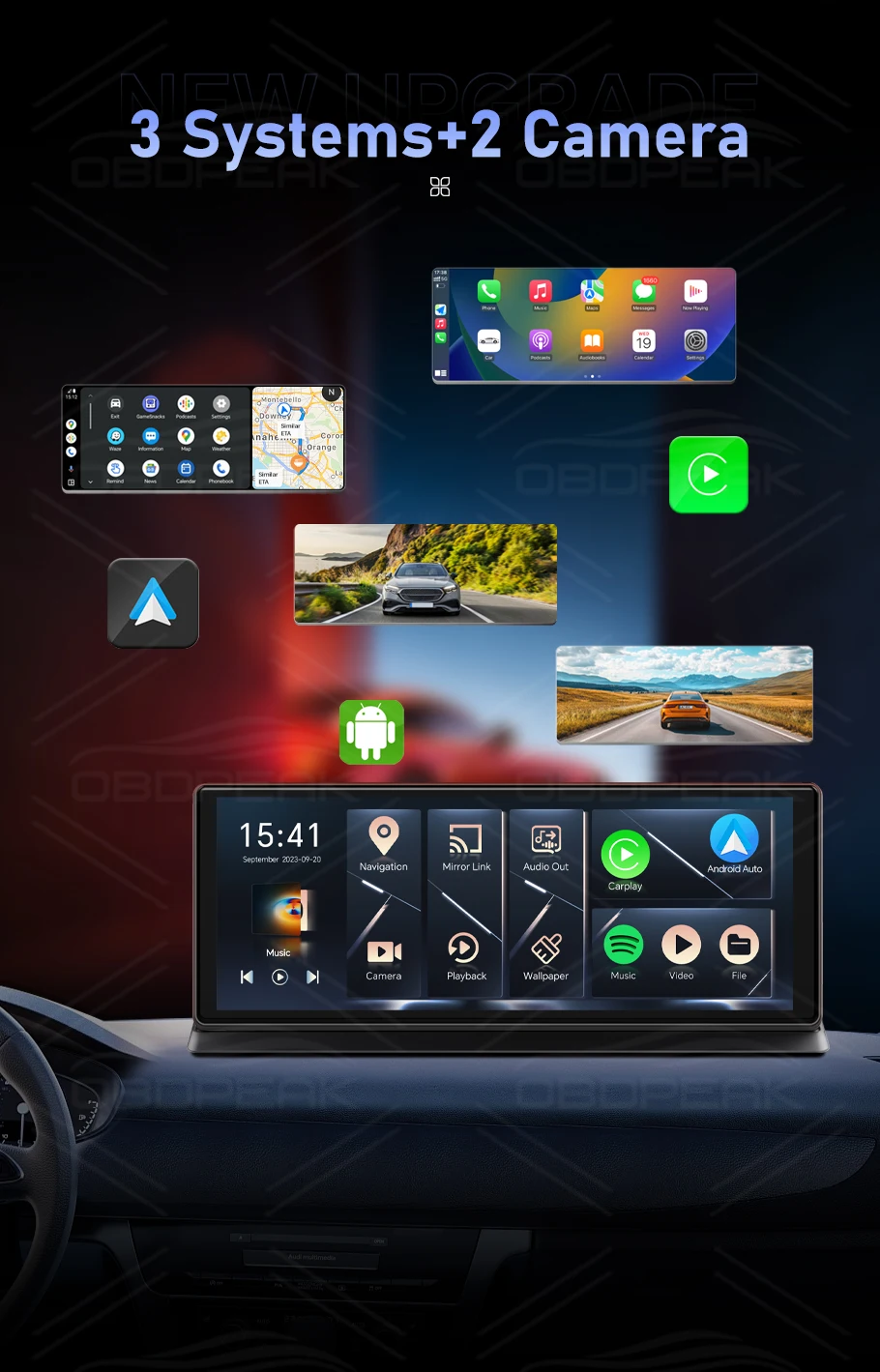The OBDPEAK K60 Pro has a crazy built-in 3 system, Android 14 system/Carplay system/Android Auto system, and has added an Dual Lens to meet all your car driving needs!