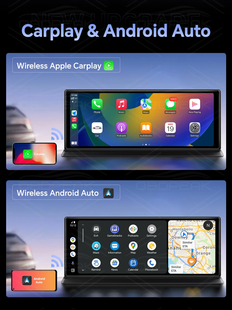 The OBDPEAK K60 Pro recorder uses the latest technology, supports wireless Carplay and Android Auto functions, users can easily and safely make calls, listen to music, send and receive messages, use navigation, support Siri, and more. (Wireless Connections, via BT or WiFi)