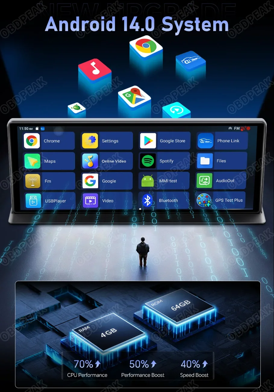 OBDPEAK K60 PRO has once again upgraded its system, using 4GB+64GB of memory, equipped with Android 14 system, and matched with the new CPU/GPU architecture. Its performance has been improved by more than 70% compared to T30, and it can also use exciting applications such as Google Play, Maps, and online video/music playback software