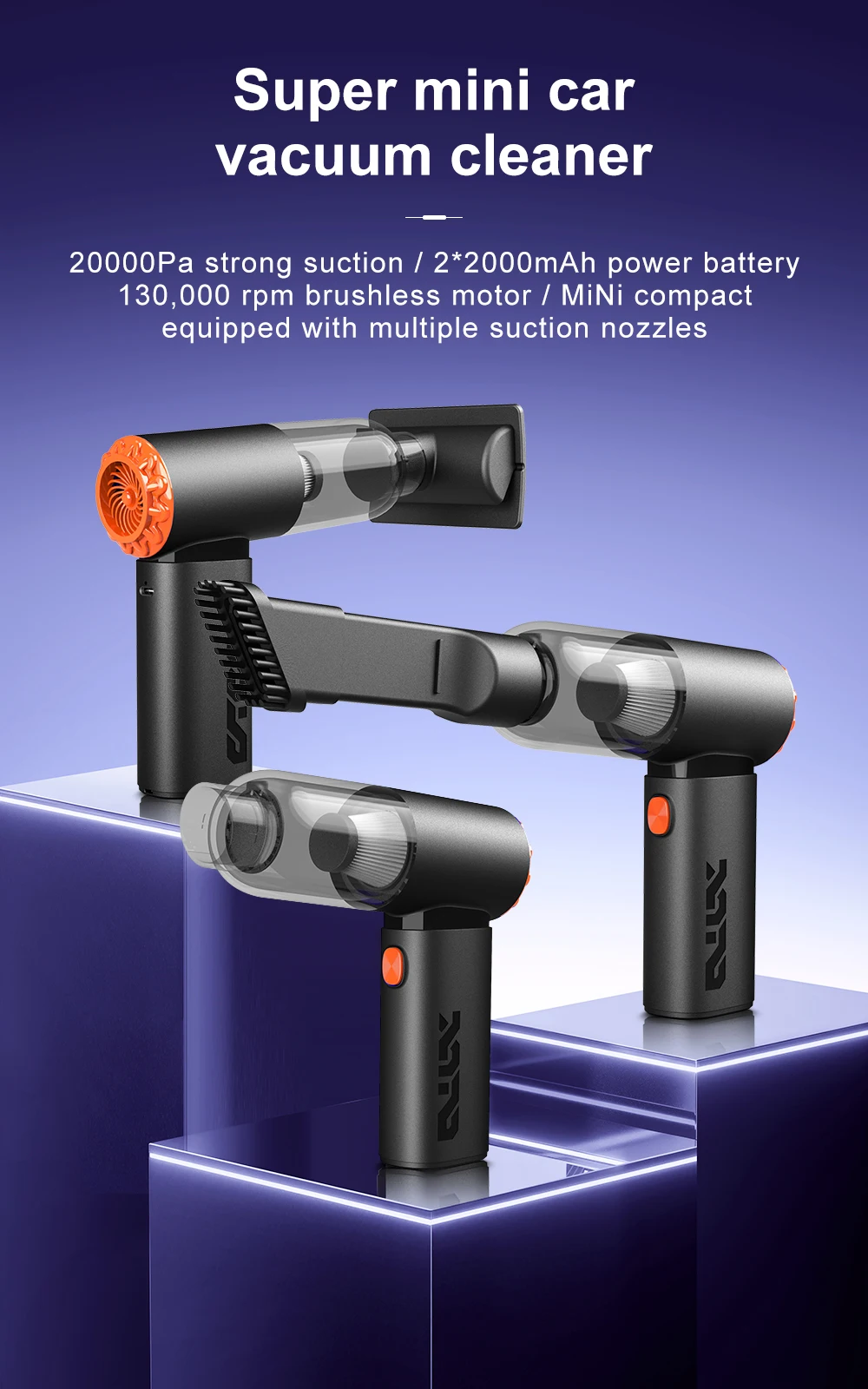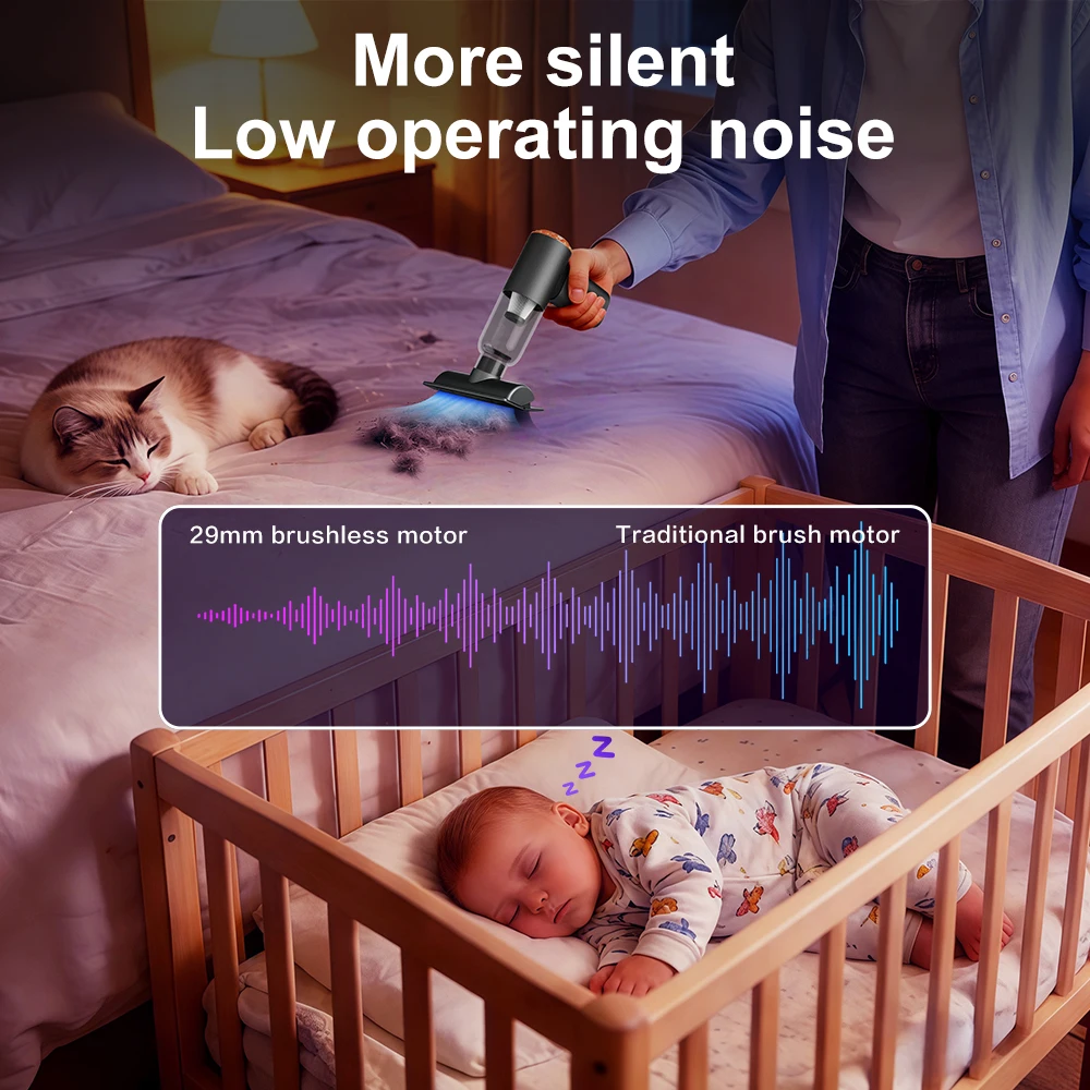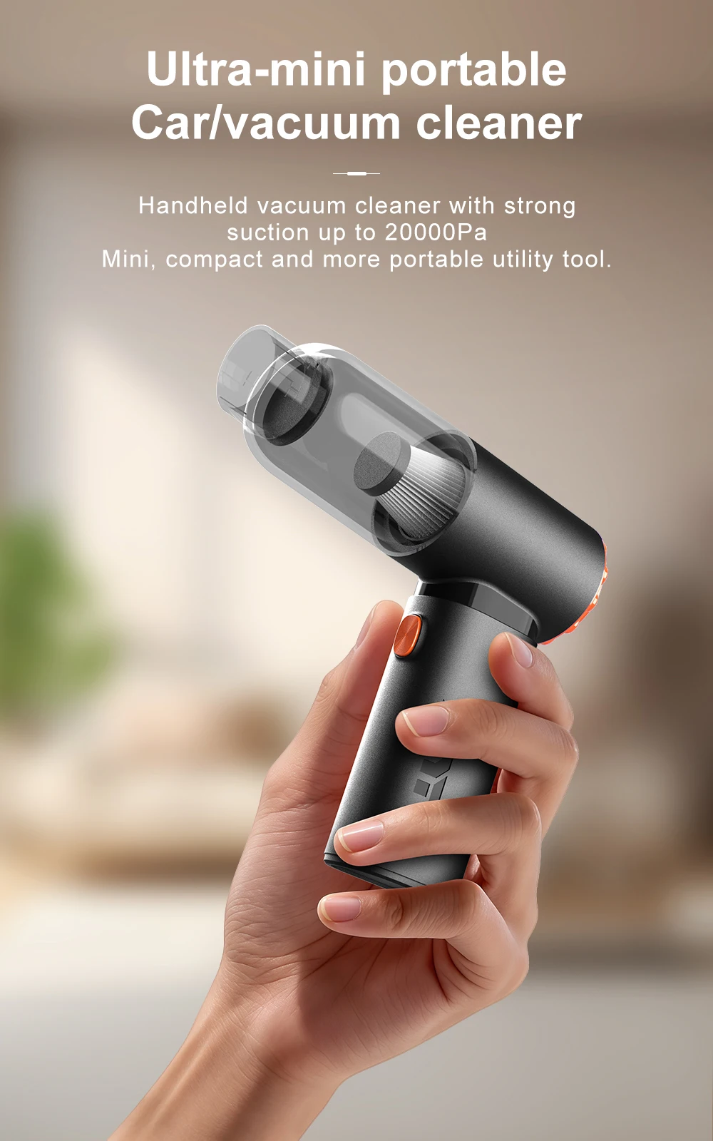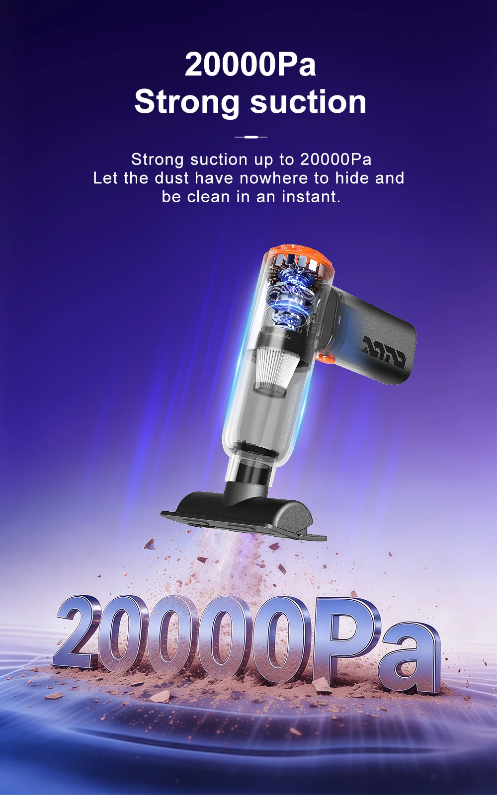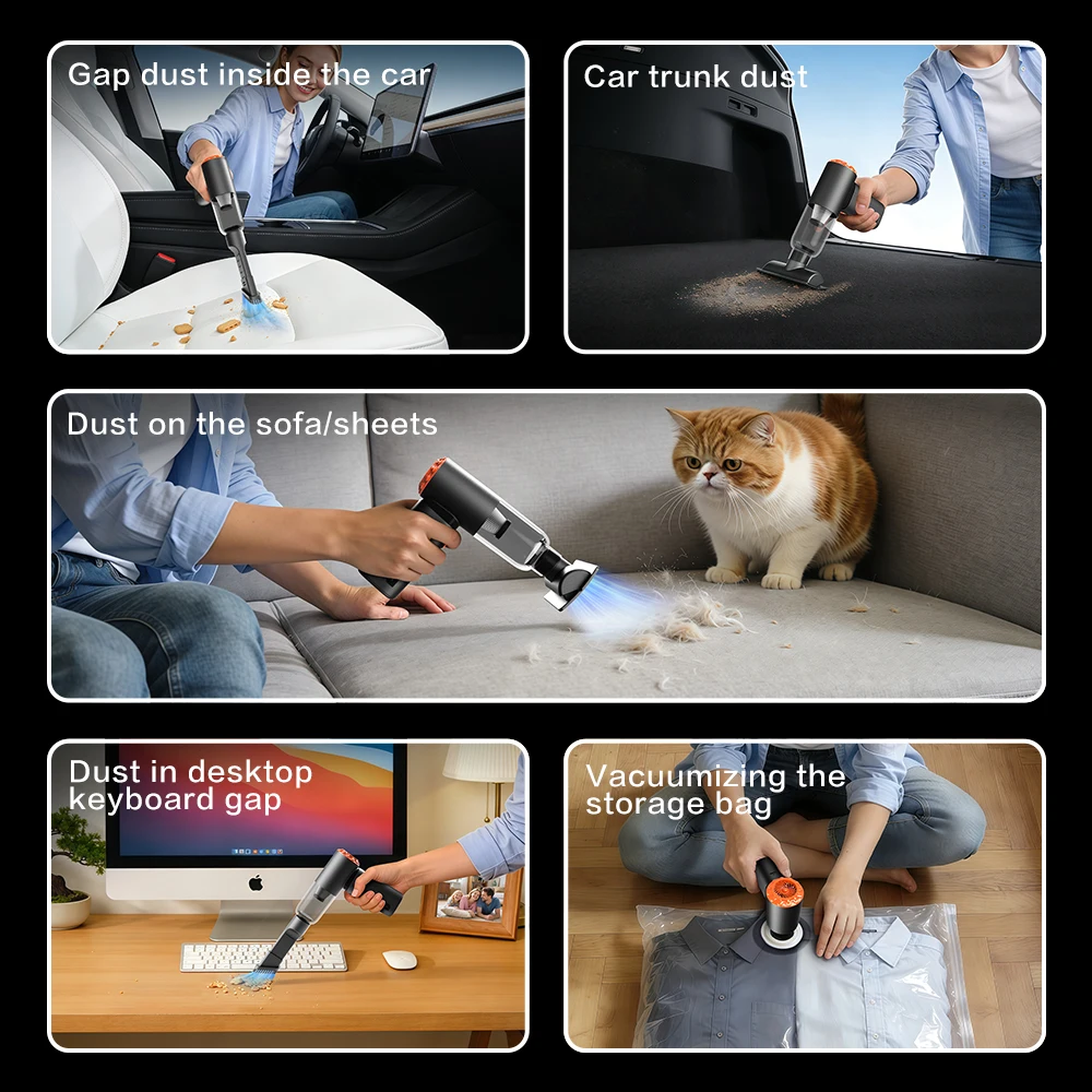 1. High power suction: The powerful motor generates a strong suction force of 20000PA, which absorbs dirt such as dust, hair, and debris from the car interior.