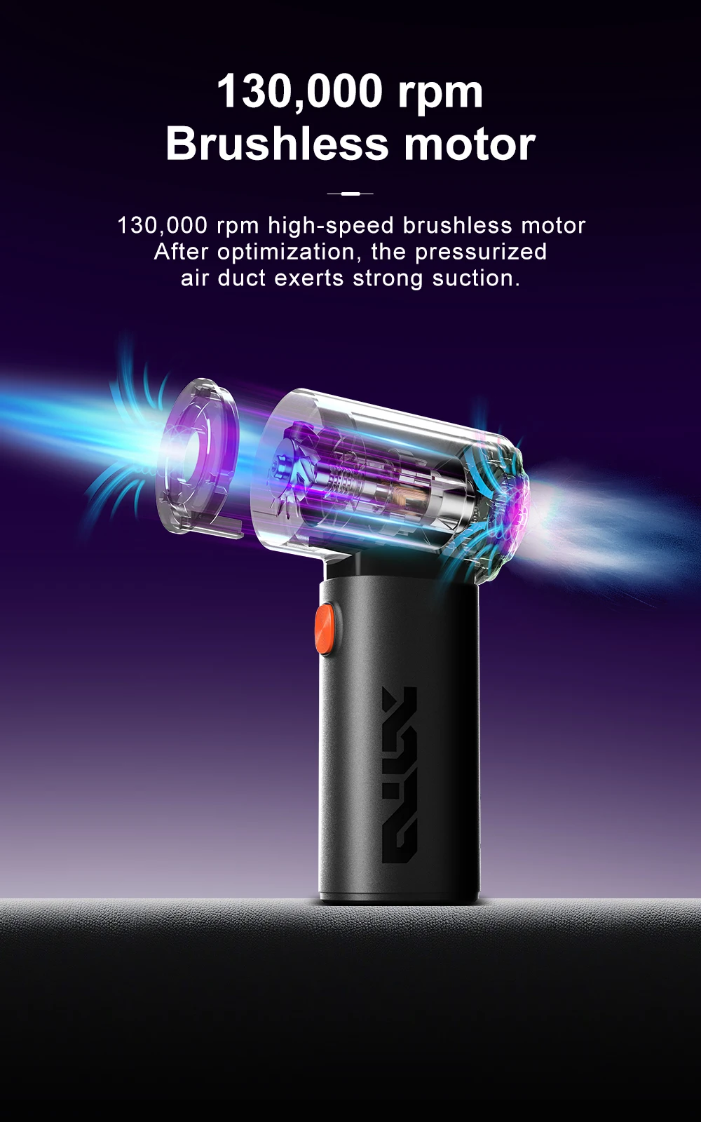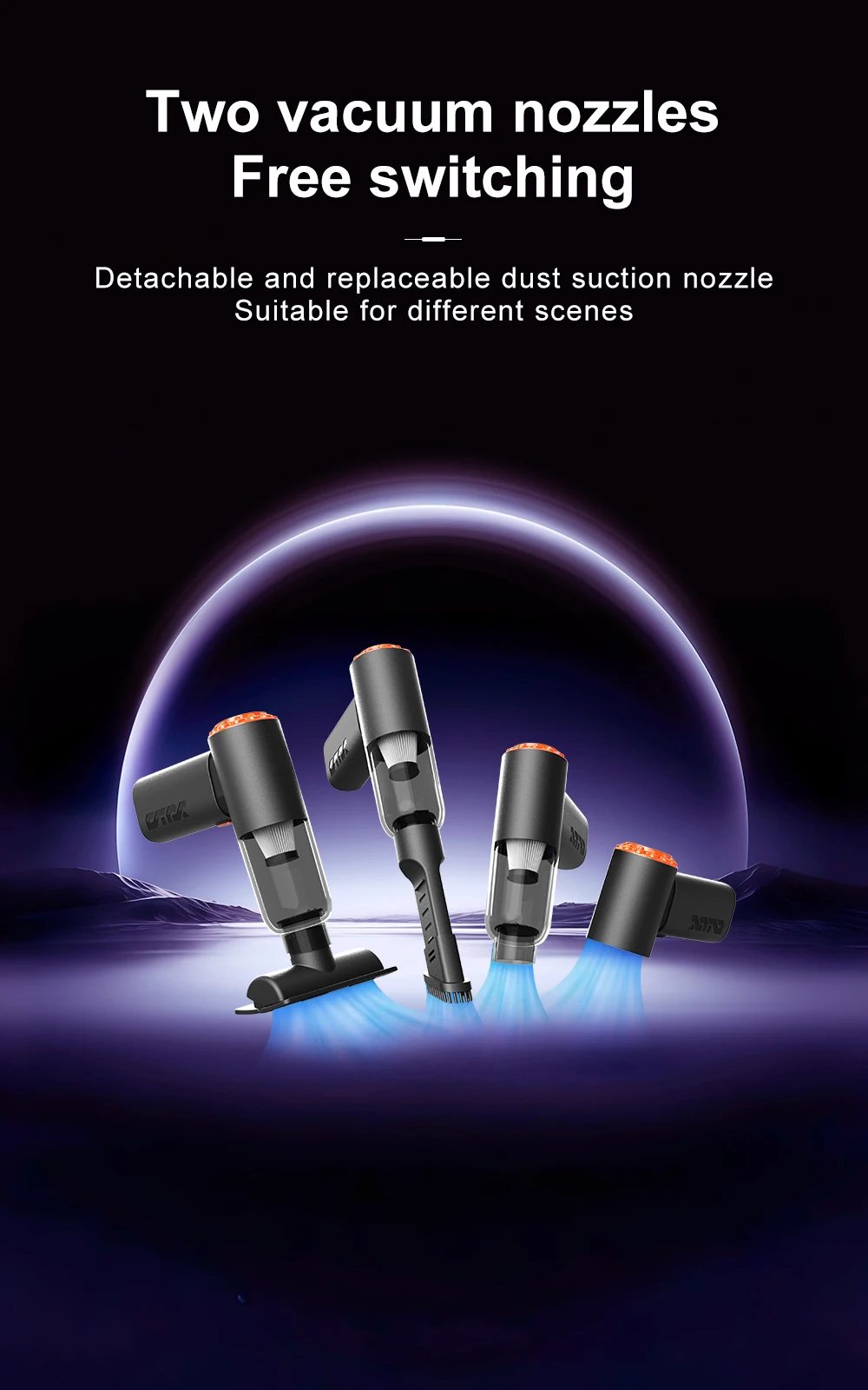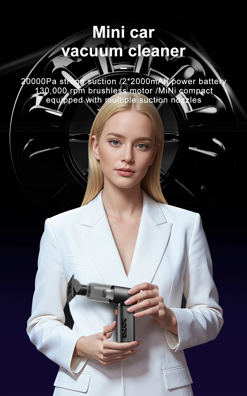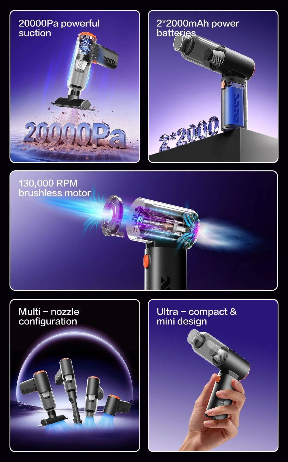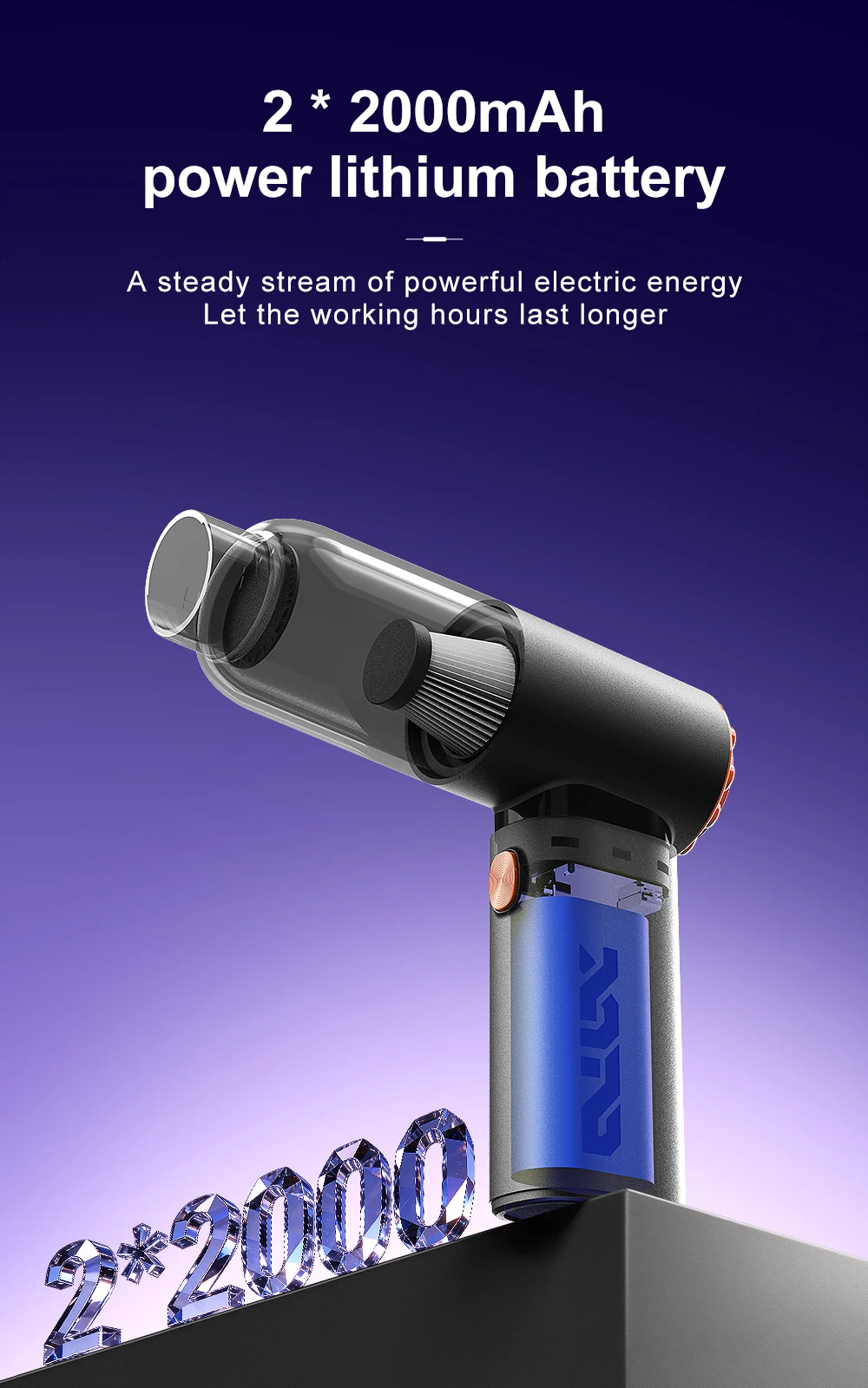 1. High power suction: The powerful motor generates a strong suction force of 20000PA, which absorbs dirt such as dust, hair, and debris from the car interior.