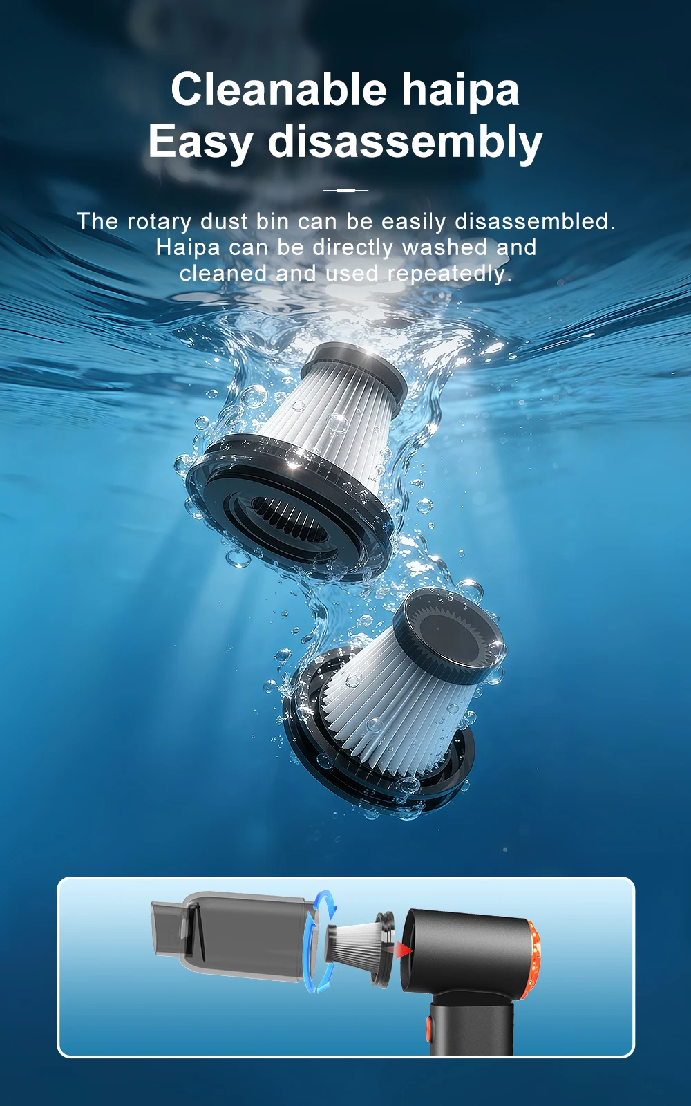 3. Washable filter: Rinsed clean, dry, no need to replace
