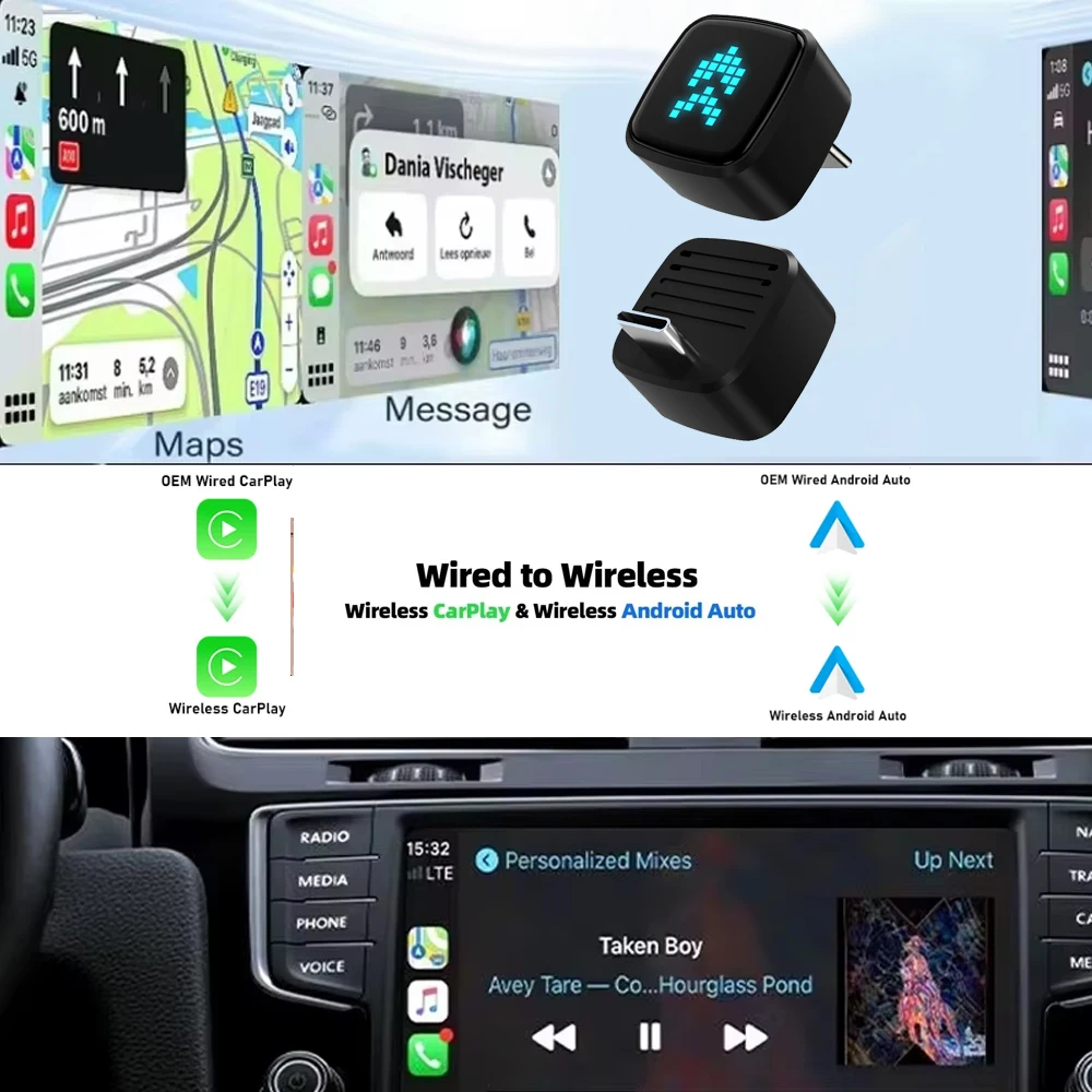 1.CarPlay Wireless Adapter:Convert wired CarPlay to wireless CarPlay and Convert Wired Android Auto to Wireless Android Auto. The CarPlay wireless adapter perfectly frees you from tangled cables, making your car cleaner and enjoying a relaxing driving journey. Keeping the original car operating system, you can continue to use full CarPlay functions, such as GPS navigation, making calls, music playback, voice assistant, and sending and receiving messages.