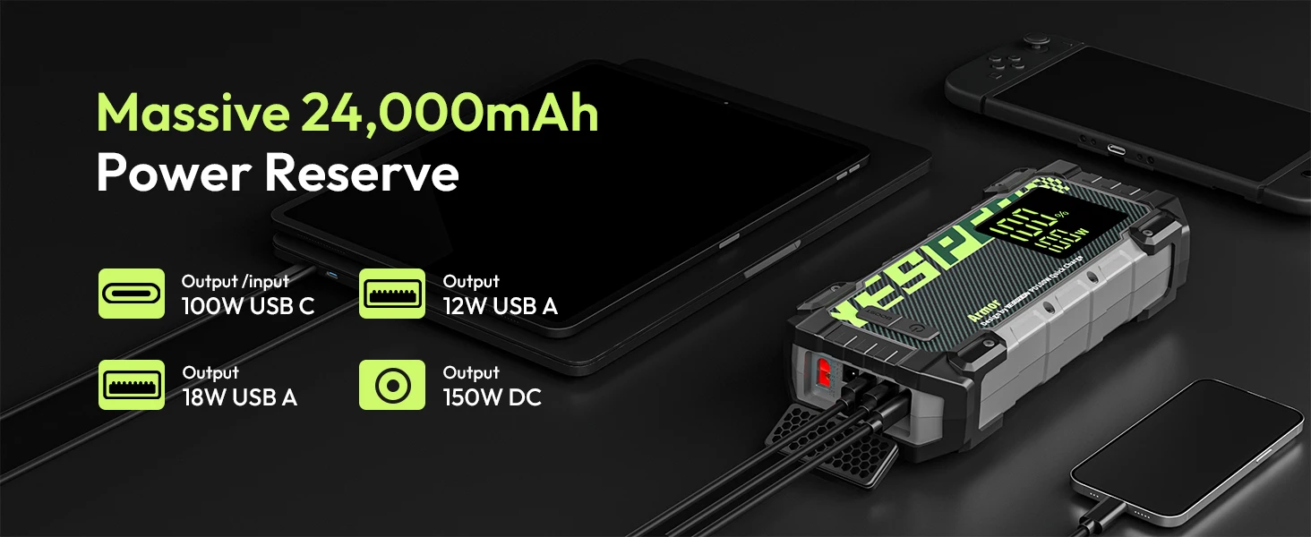 Beyond A Jump Starter- Serves as a 24000mAh portable power bank, recharging smartphones, tablets, and other USB devices;as a 15-volt portable power, powering all 15V/12V DC devices, like tire inflators, inverters, and more