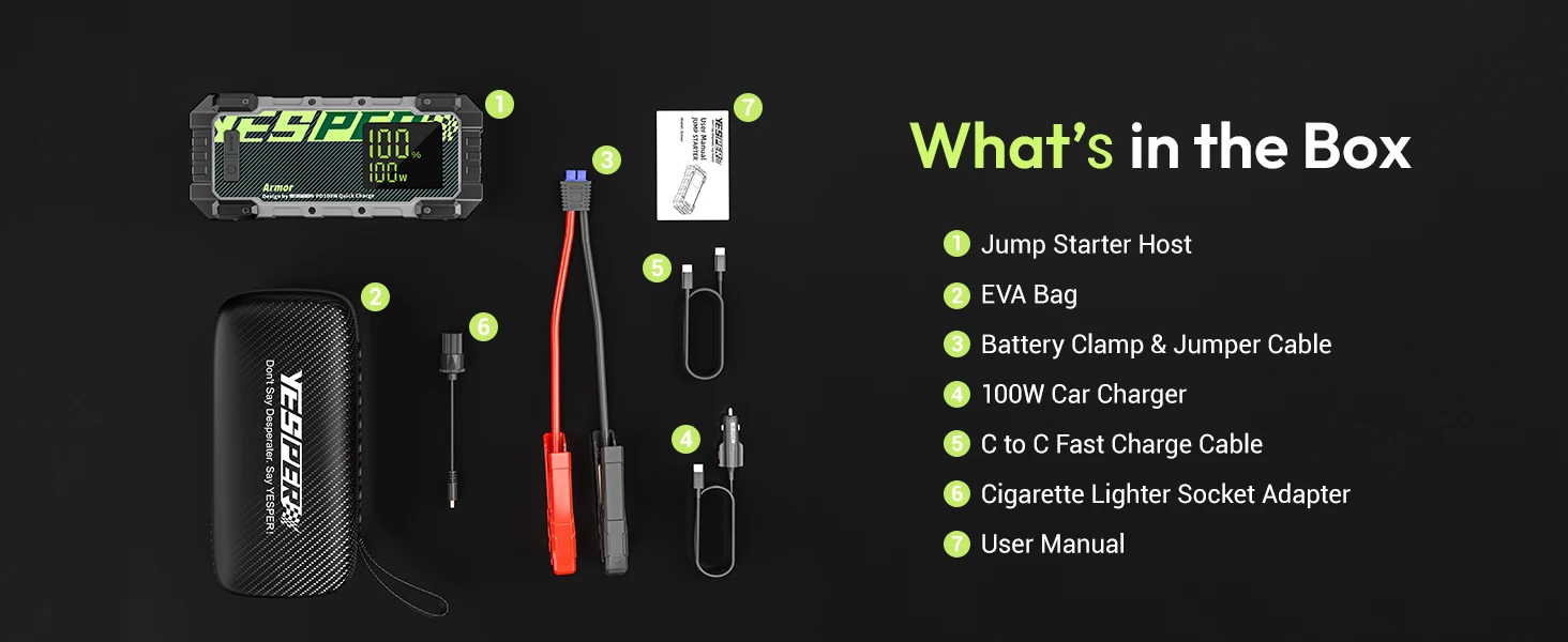 [What You Will Get]- 1*4000A Jump Starter (24000mAh), 1 *Jumper Cable, 1*100W Car Charger, 1*60W USB-C to C Cable, 1*Cigarette Lighter Socket Adapter, 1*User Manual. If you have any questions or concerns, please get in touch with us