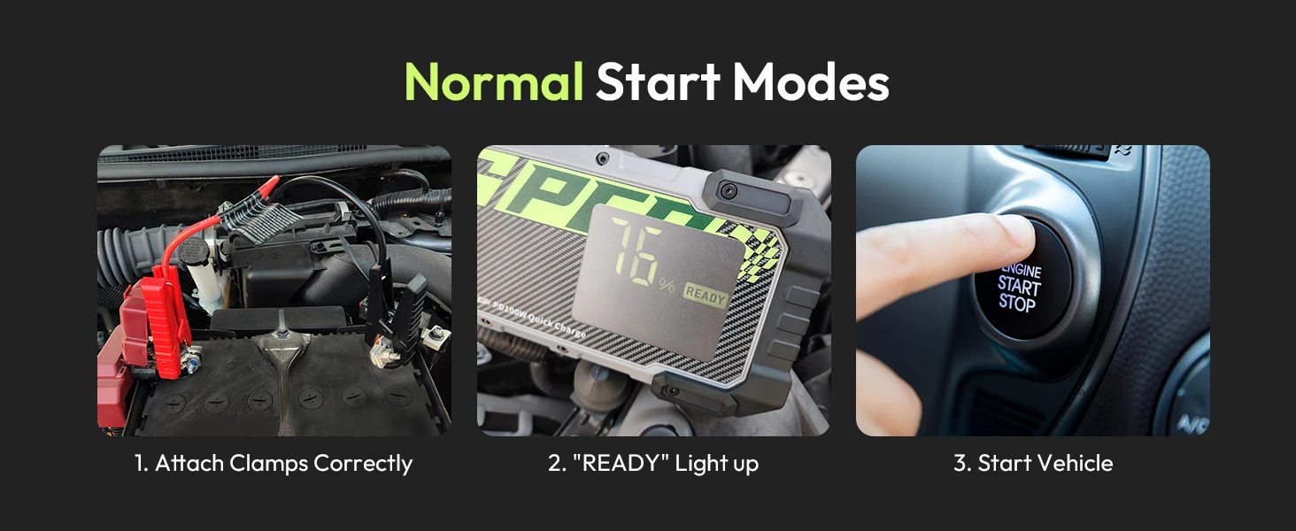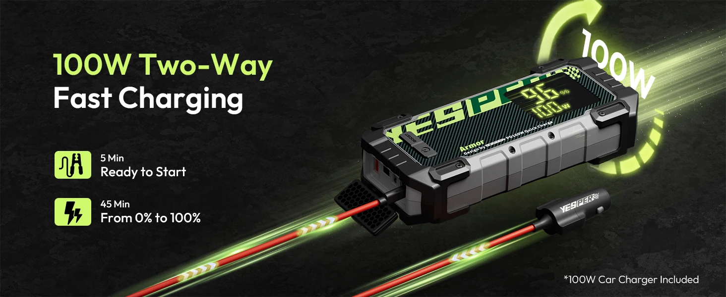 100W Fast Charging Cables- The jump starter battery pack can be charged from 0% to 100% in 45mins via the included 100W car charger. 5 minutes of charging is enough to start a car