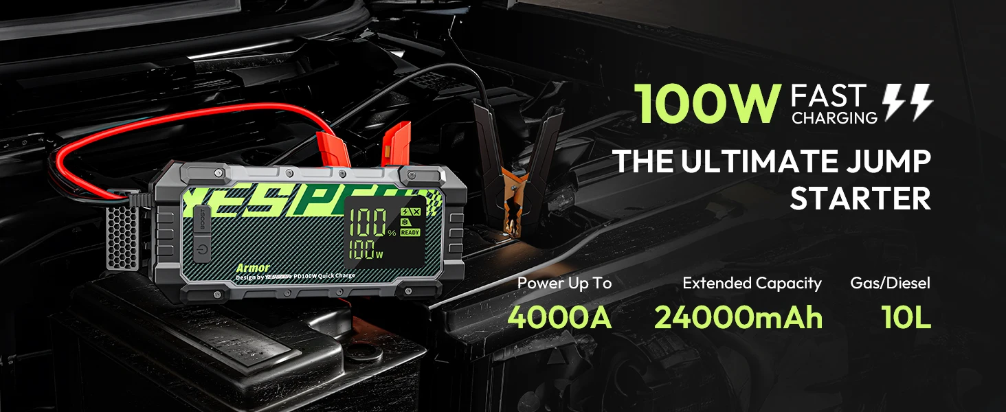 Powerful car starter- YESPER Armor car battery jump starter is the ultimate solution for starting completely dead car batteries, with a 4000 amps peak cranking power. Suitable for 12V vehicles up to ALL Gas/10L Diesel engines